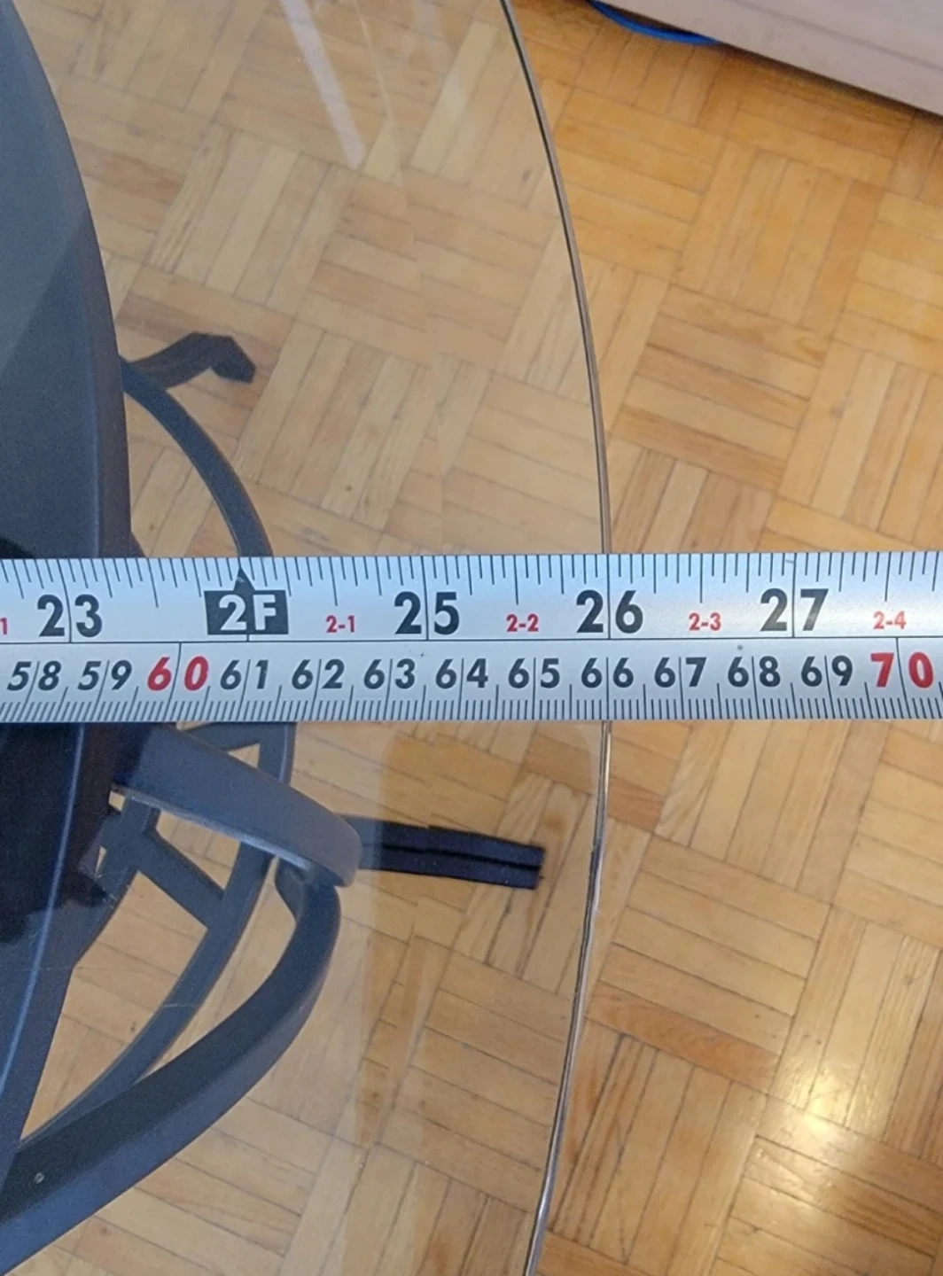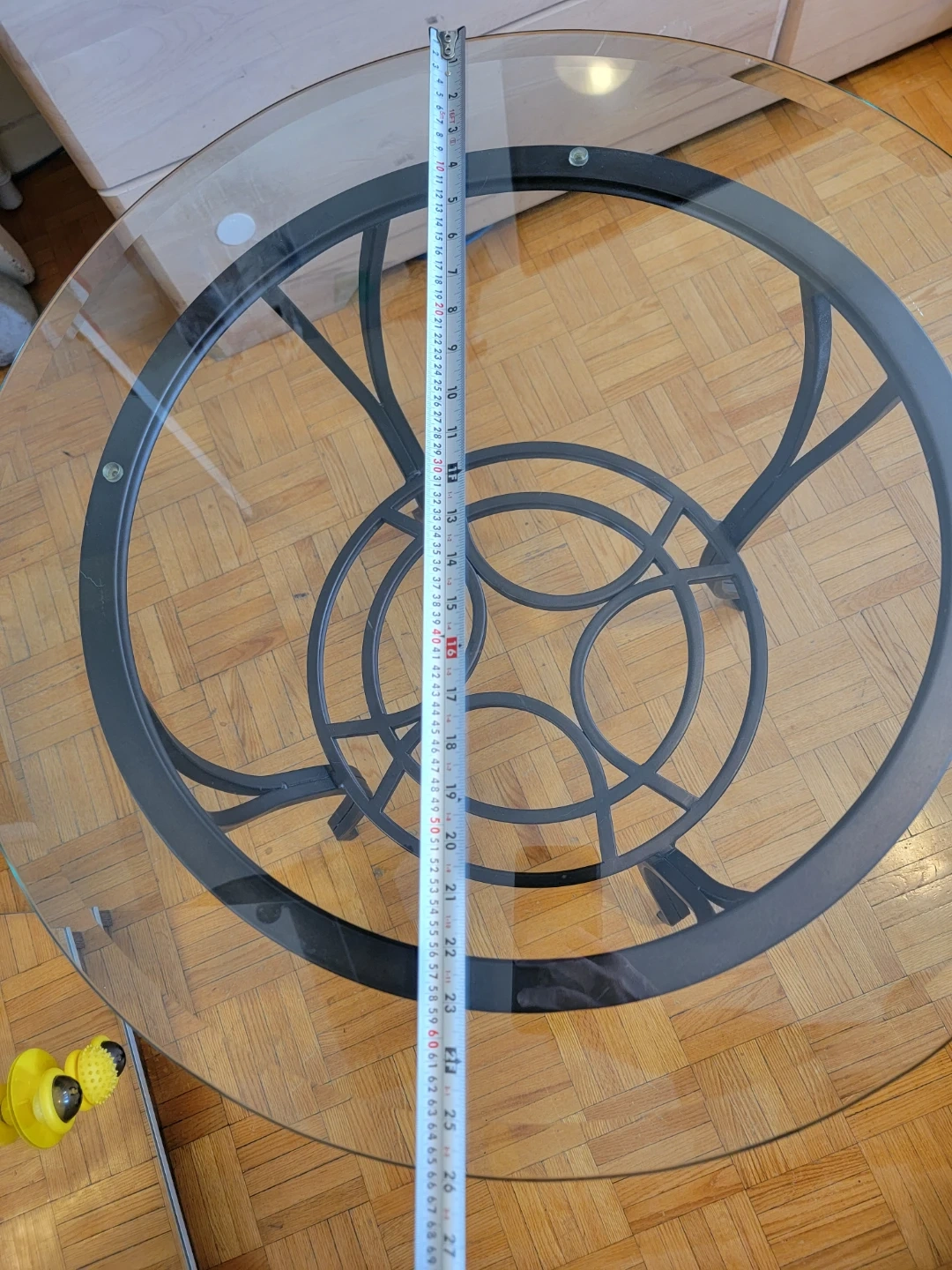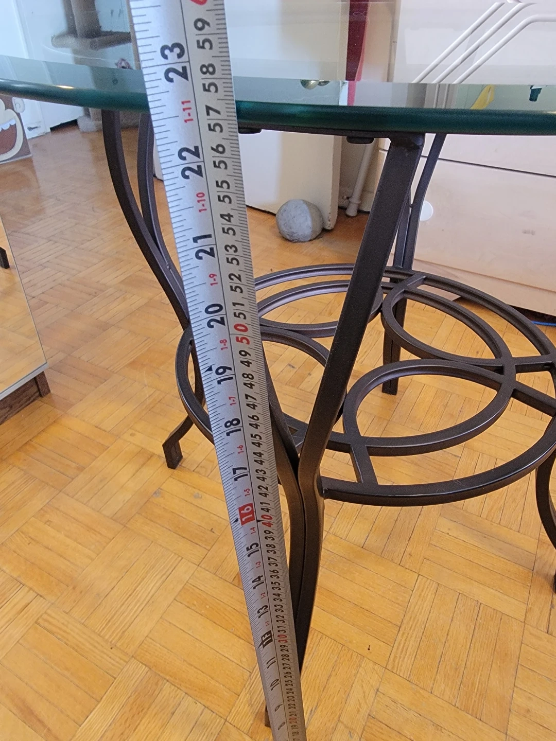 It's roughly 26 inches (66cm) in diameter and stands about 22 inches (57.5cm) tall. The metal base provides sturdy support for the glass surface.