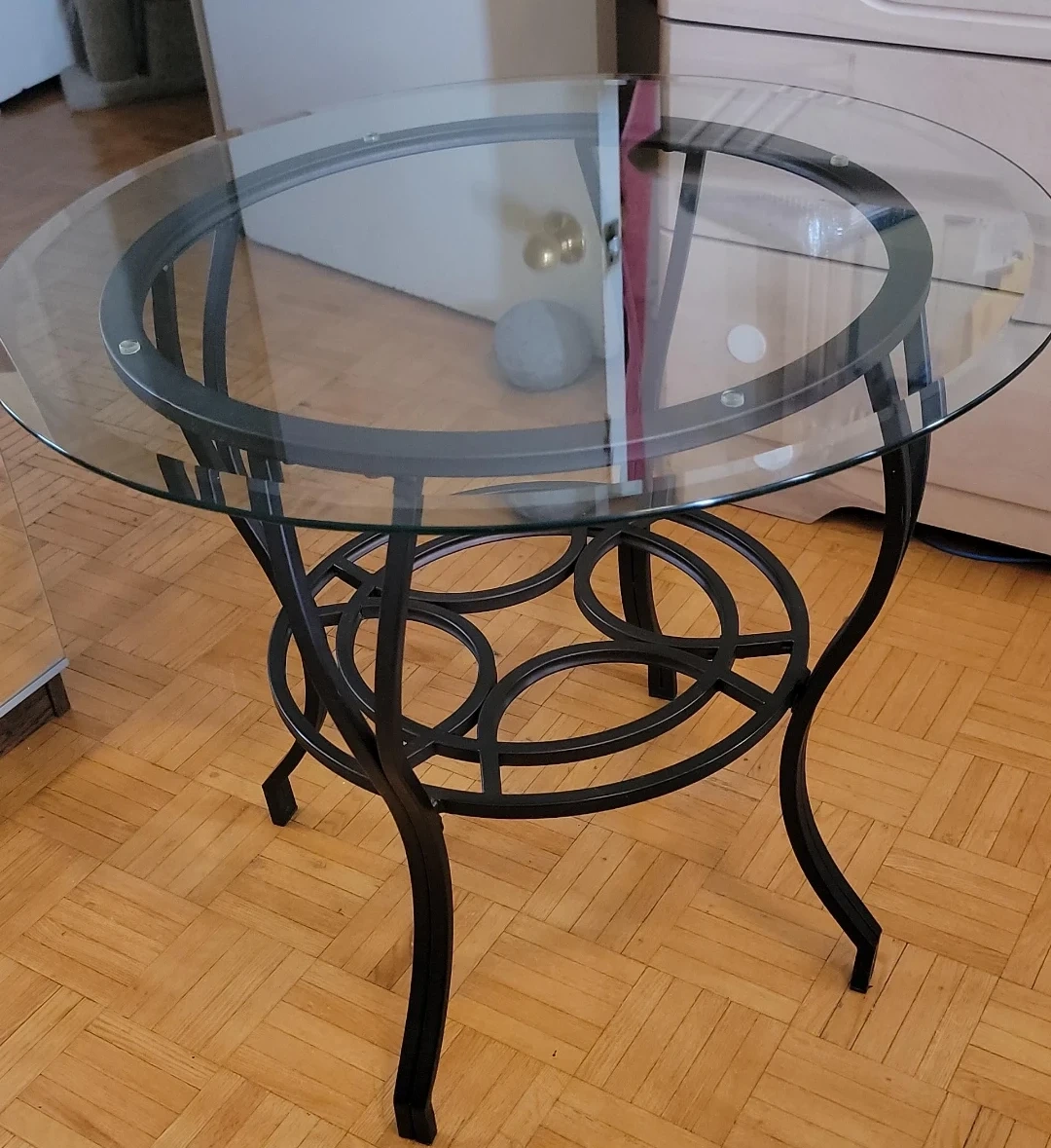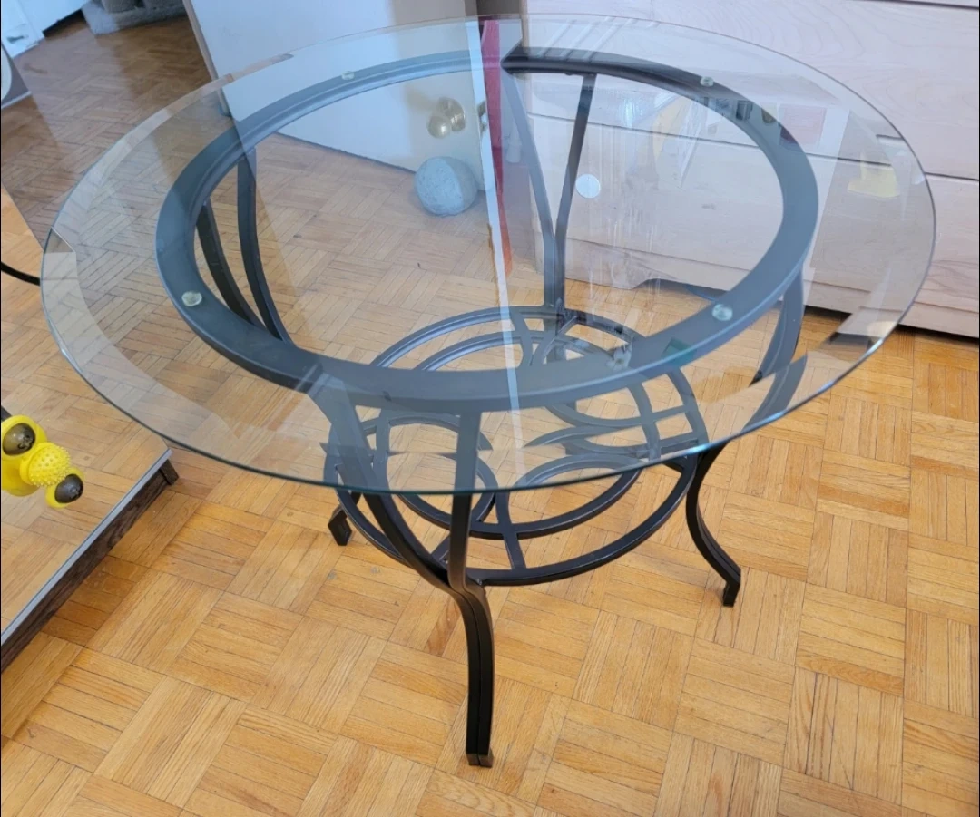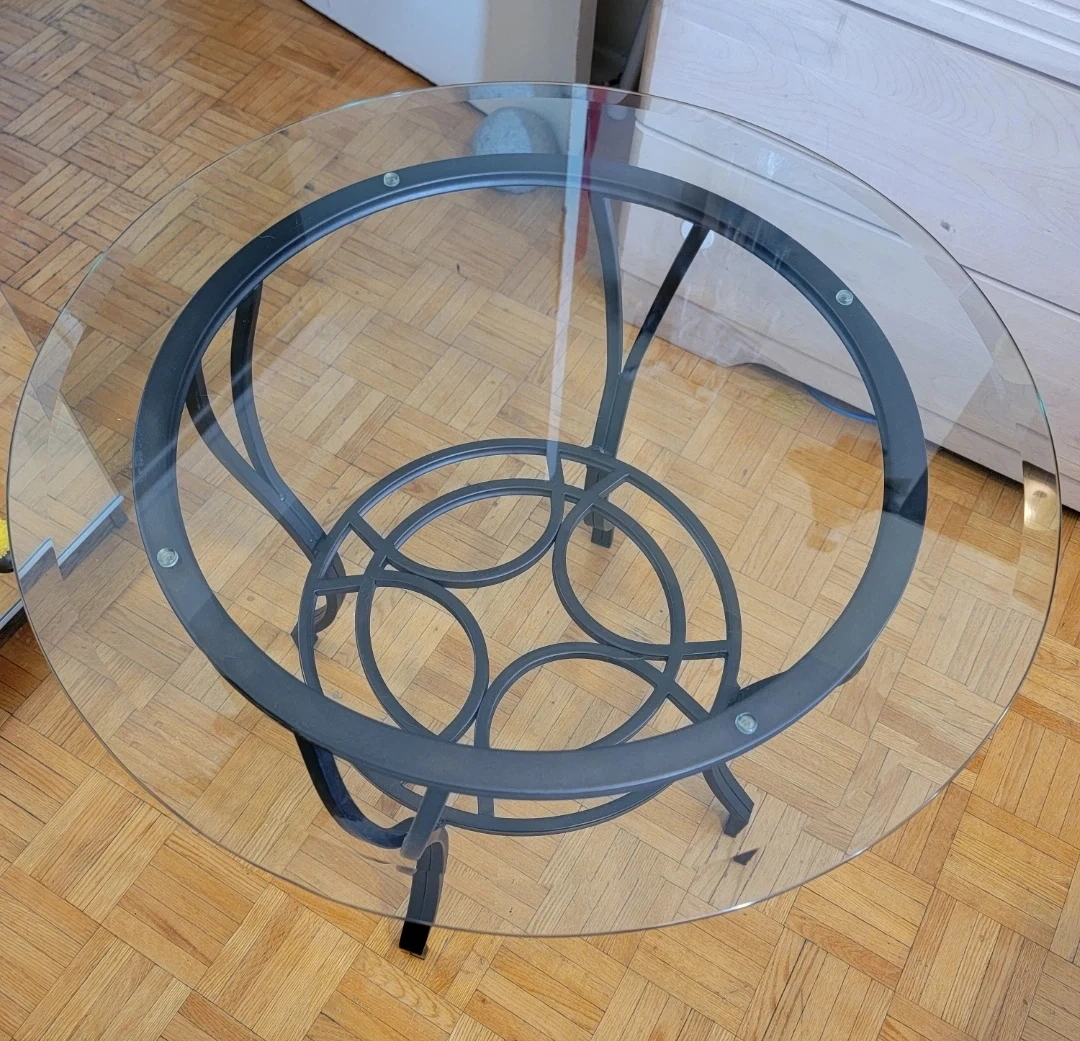 I'm selling this charming round side/coffee table. It has a clear glass top and a sturdy dark brown metal base with decorative details.