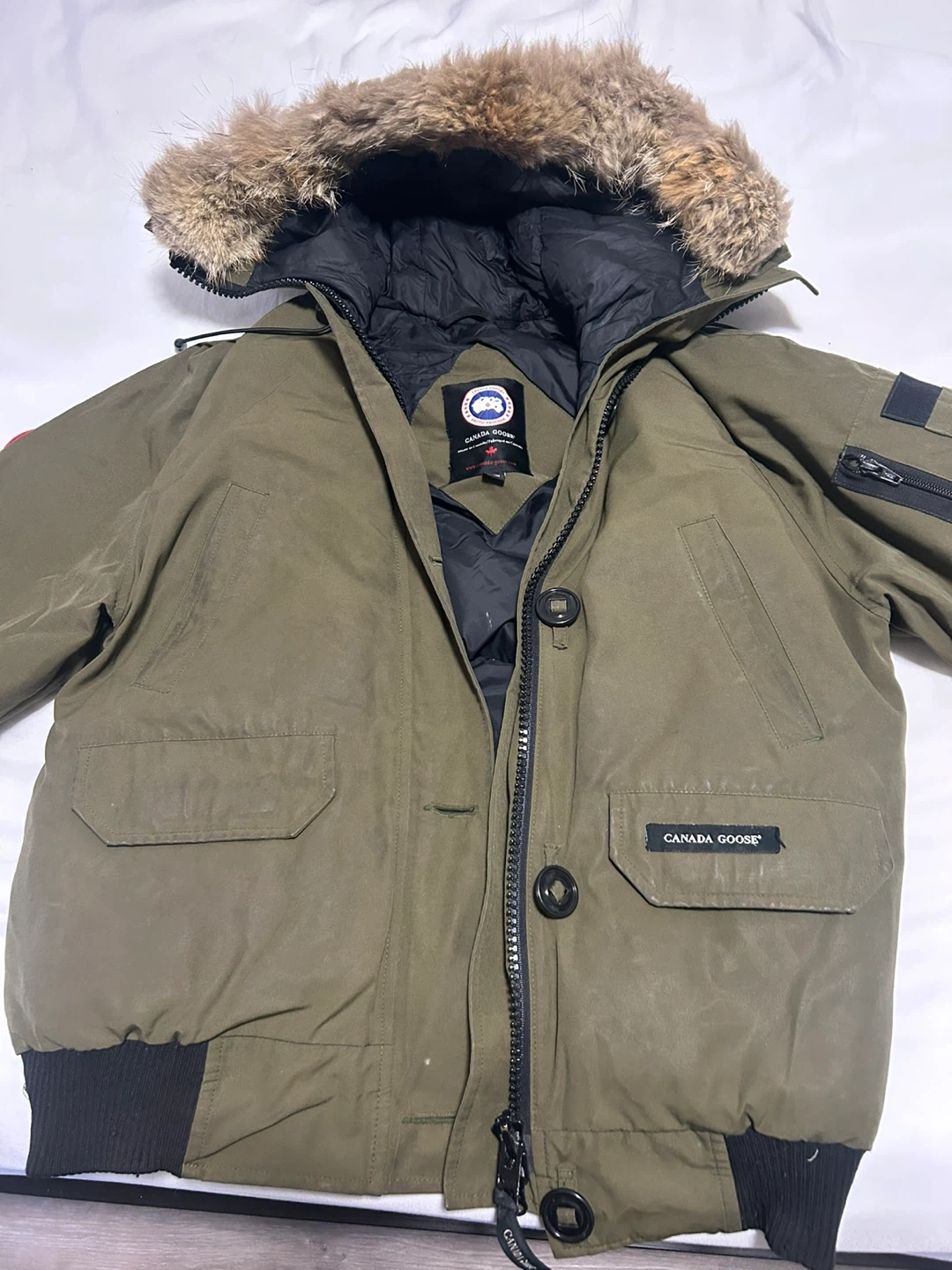 Classic Canada Goose bomber jacket in olive green. Features a fur-lined hood and durable construction. Some minor wear is visible on the sleeves. It's a great jacket for cold weather!