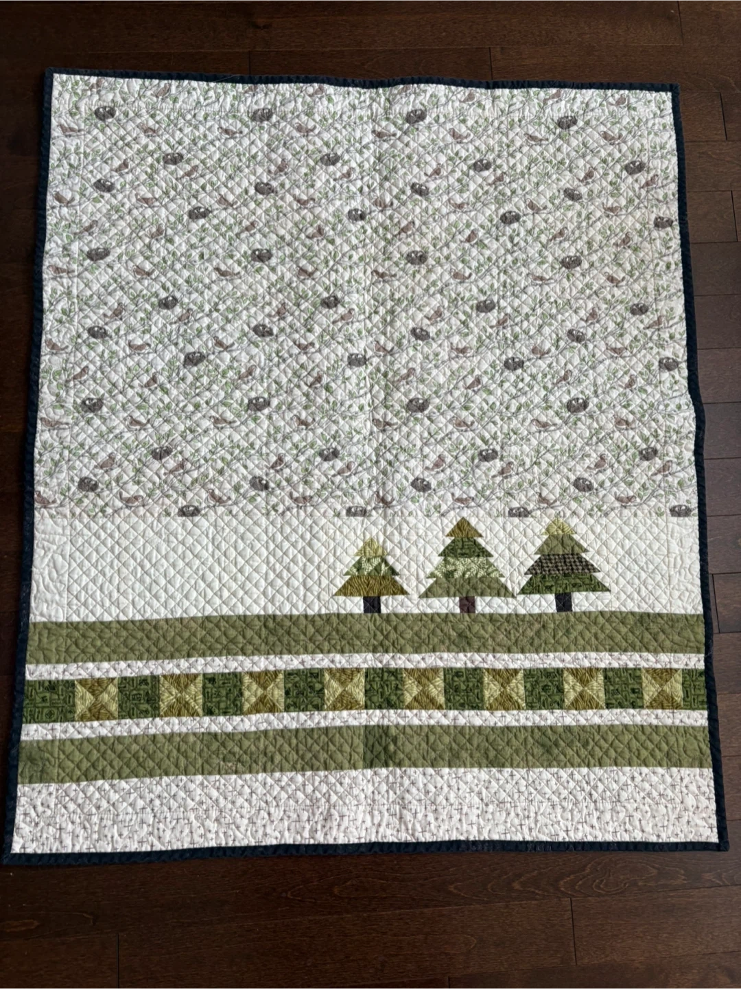 This beautiful handmade quilted throw blanket features a charming woodland theme with trees and birds. It's perfect for adding a cozy touch to any room. The quilt measures approximately 36 inches long.