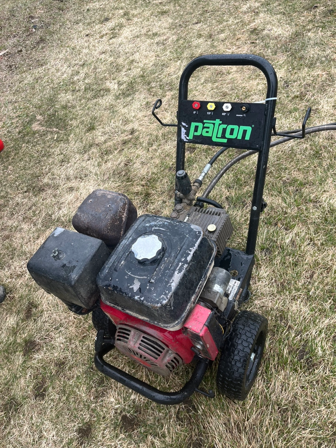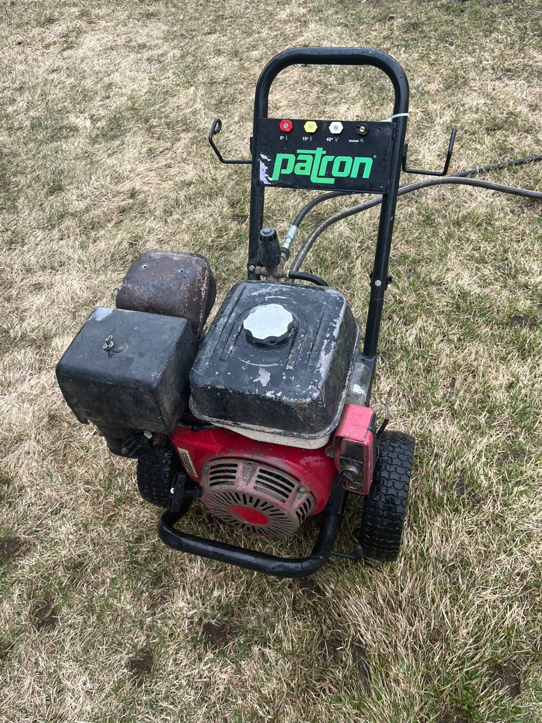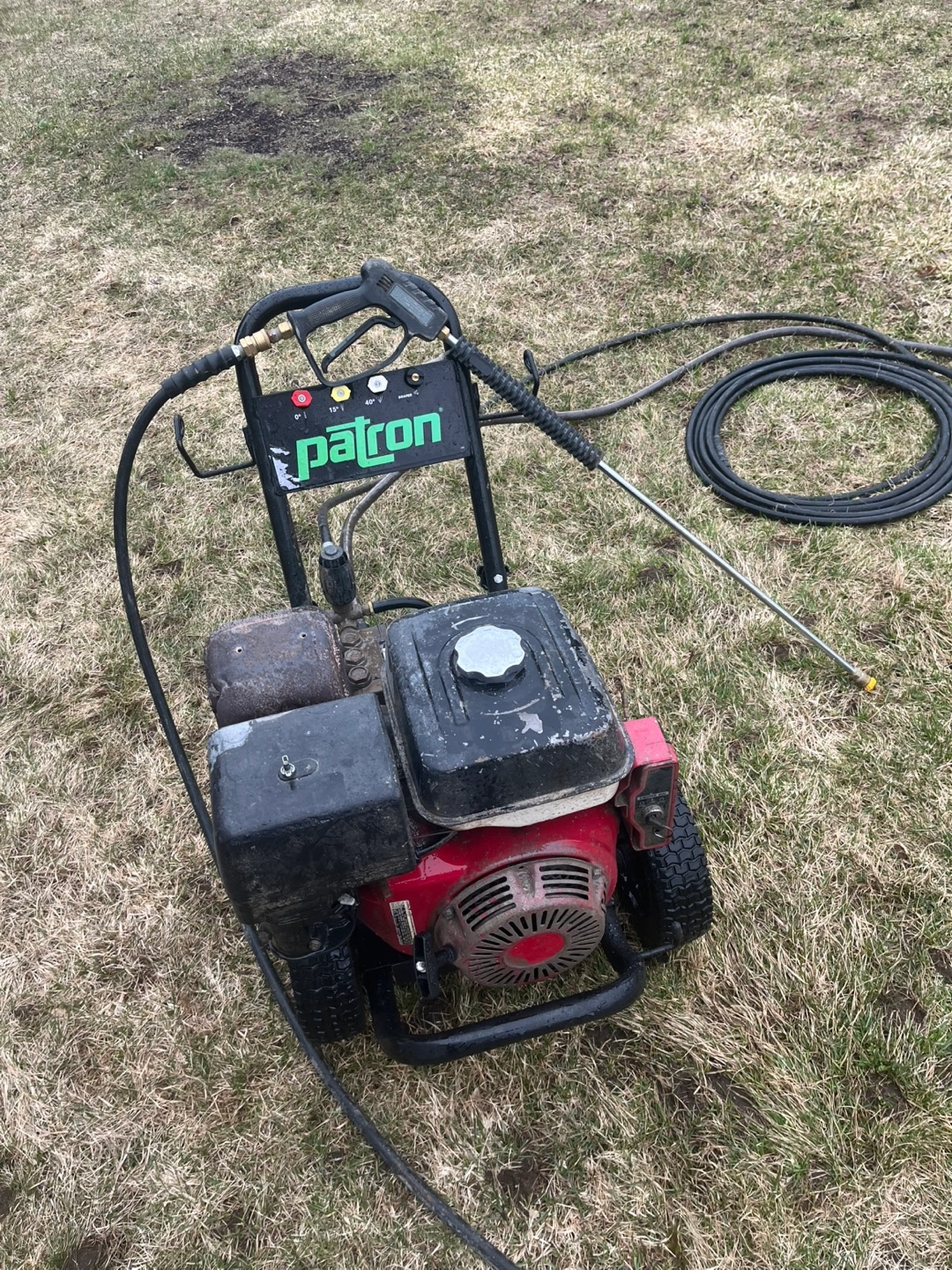 This is a used Patron gas pressure washer, perfect for tackling tough cleaning jobs around the house. It's a powerful machine with a gas engine and includes the necessary hoses and wand. Get your driveway, siding, or deck looking like new!