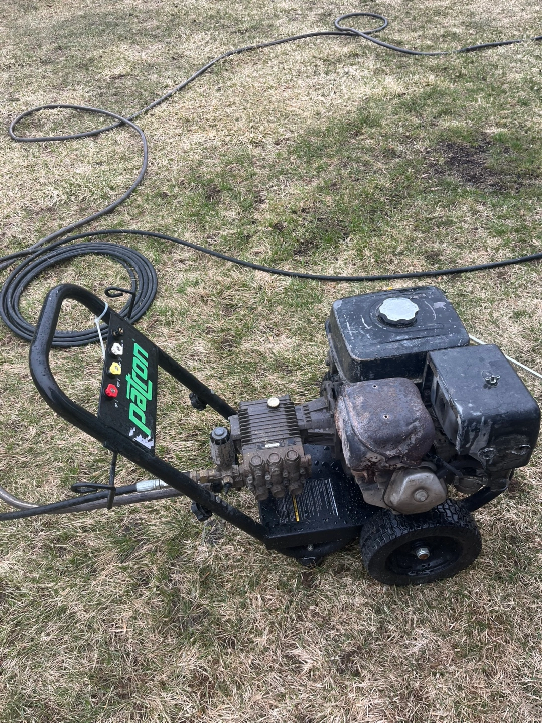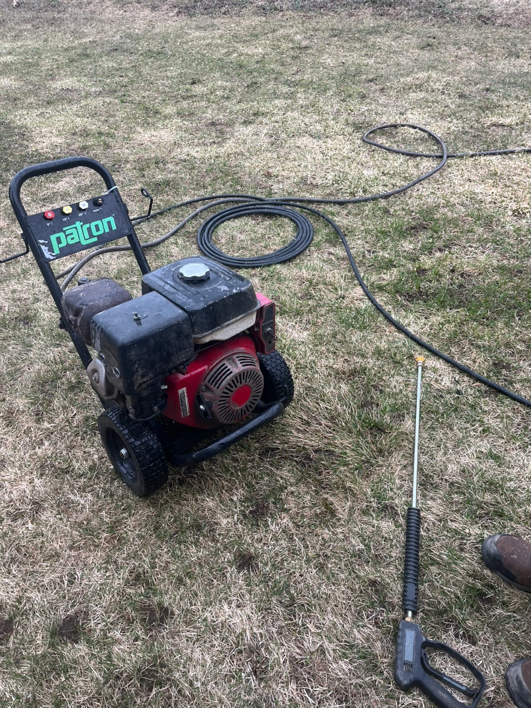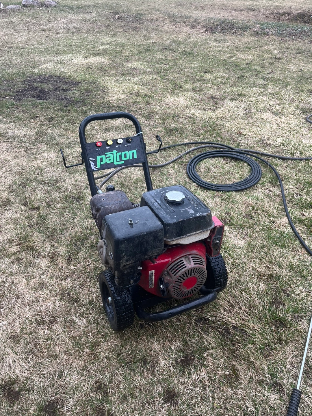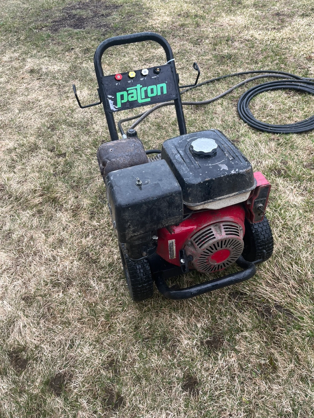 This is a used Patron gas pressure washer, perfect for tackling tough cleaning jobs around the house. It's a powerful machine with a gas engine and includes the necessary hoses and wand. Get your driveway, siding, or deck looking like new!