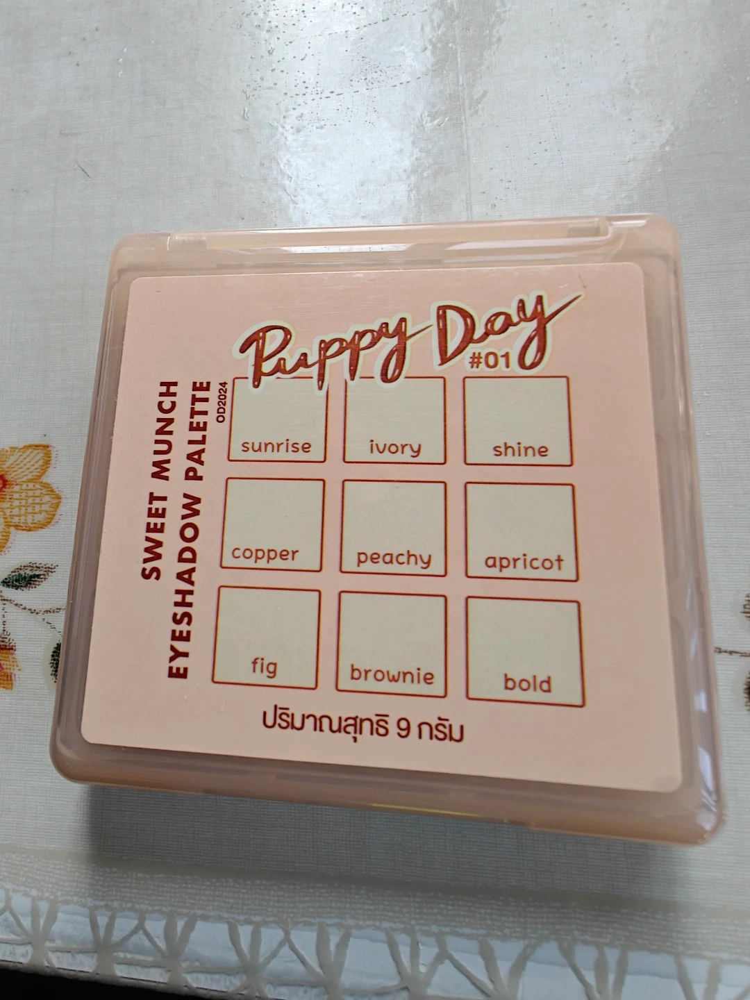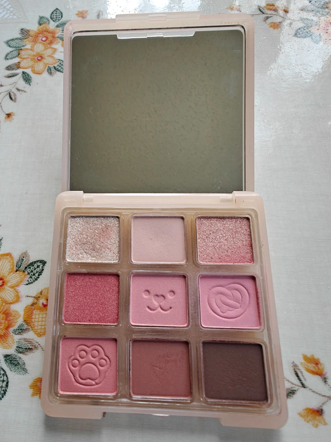 This ADBO Sweet Munch eyeshadow palette is called Puppy Day and is shade #01. It includes nine shades with a mix of mattes and shimmers. The palette features cute embossed designs like a paw print and a teddy bear face.