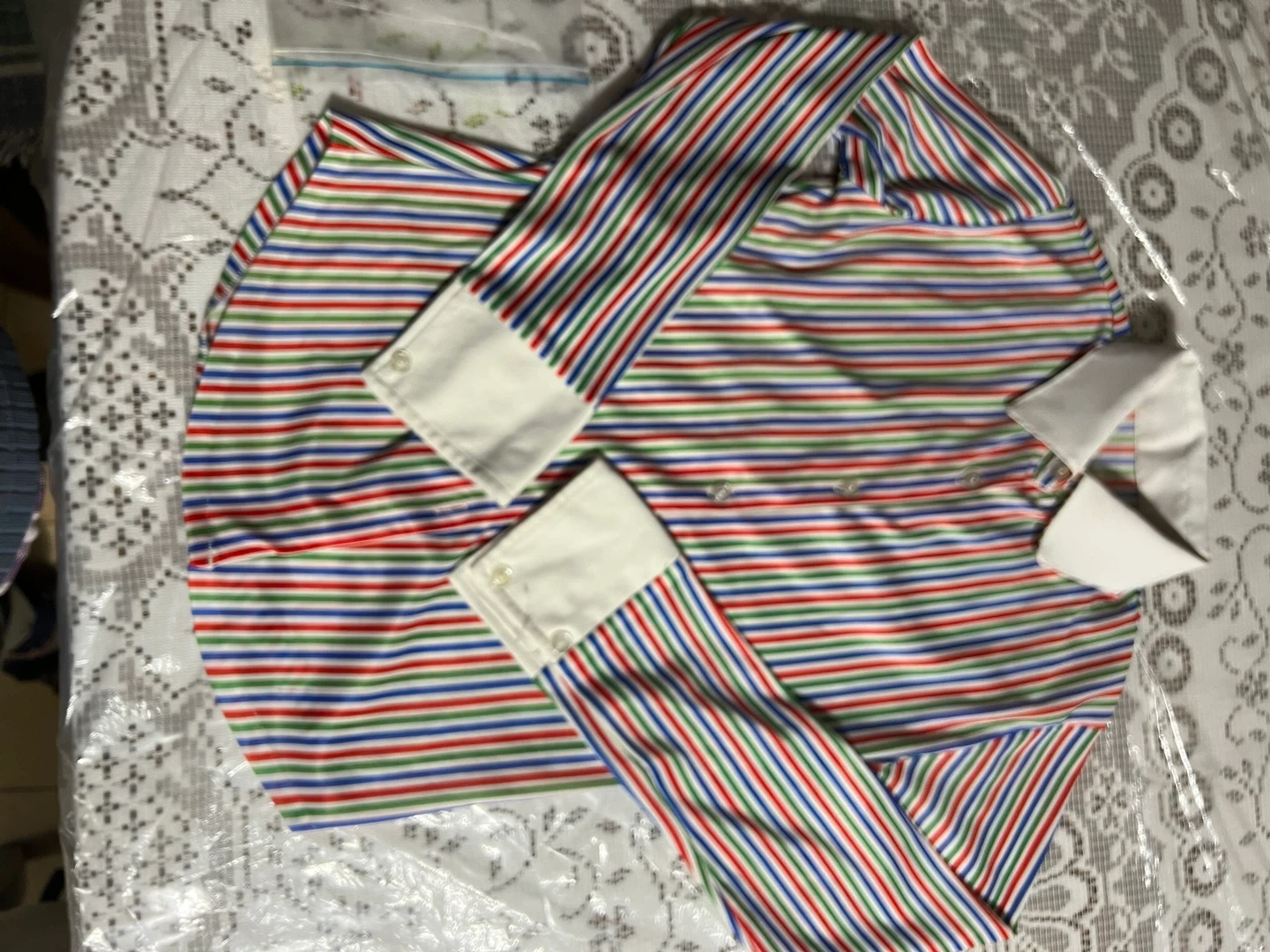 This is a colourful striped long sleeve shirt! It features red, blue, and green stripes, and has a white collar and cuffs. It is in good condition and ready for a new owner