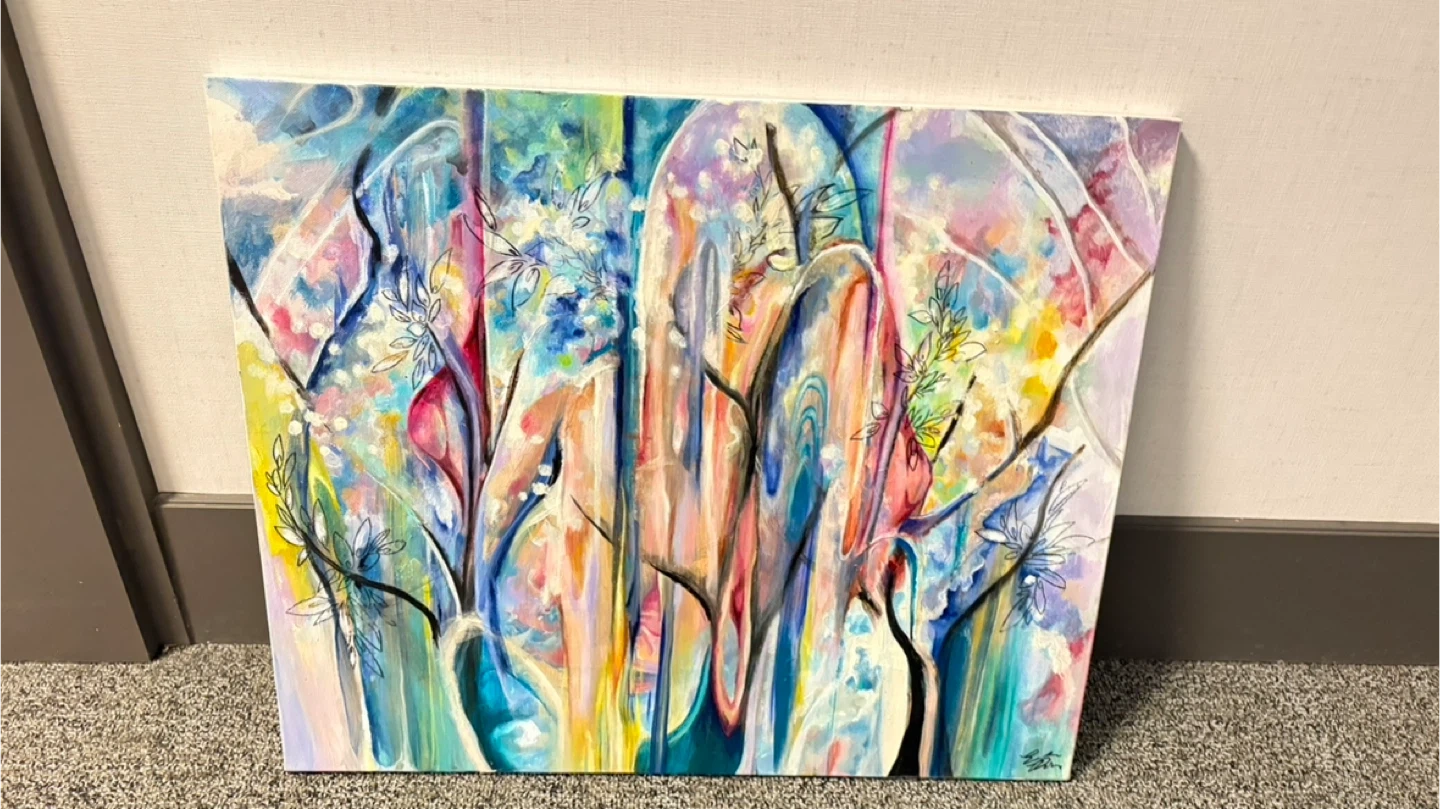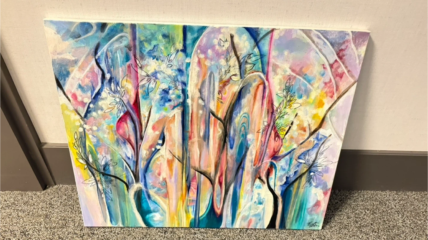 Vibrant abstract painting featuring a colourful floral landscape. It's stretched on a wooden frame and ready to hang. Adds a lovely artistic touch to any room!