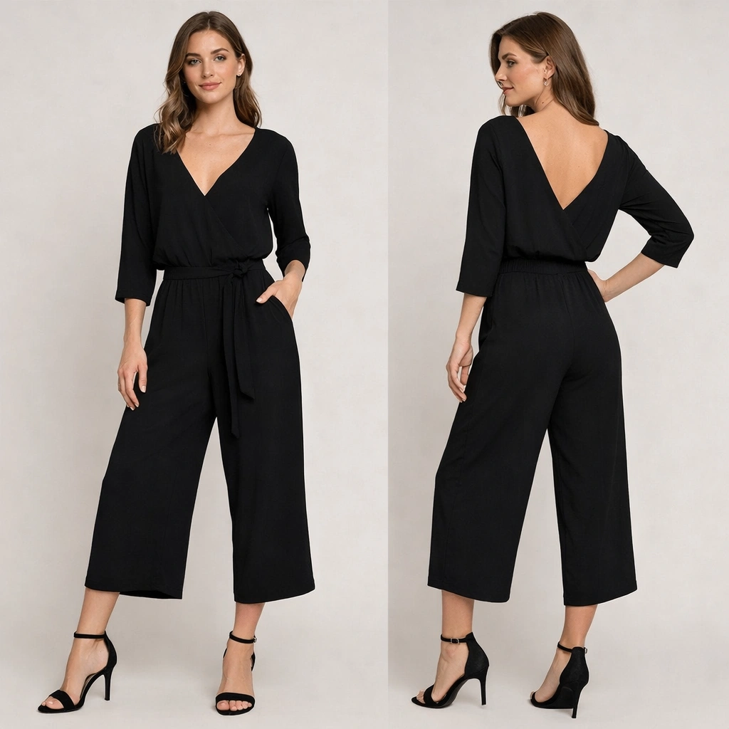 Chic, minimalisg black jumpsuit from Artizia. Features a flattering v-neckline (front and back), cropped wide leg silhouette, and an adjustable tie waist that cinches beautifully without feeling restrictive. The drapey fabric moves effortlessly and makes this an easy piece to dress up or down! Perfect for any Occassion that you want to feel polished but comfy. Barely worn and in excellent condition.