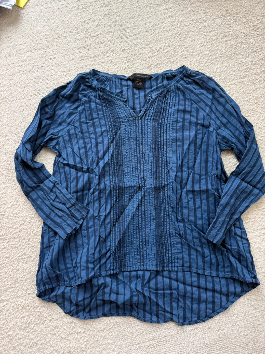 Calvin Klein linen, long sleeve blouse in a blue stripe pattern. It features a V-neck with subtle pleating detail on the front. Made with a lightweight fabric perfect for layering.