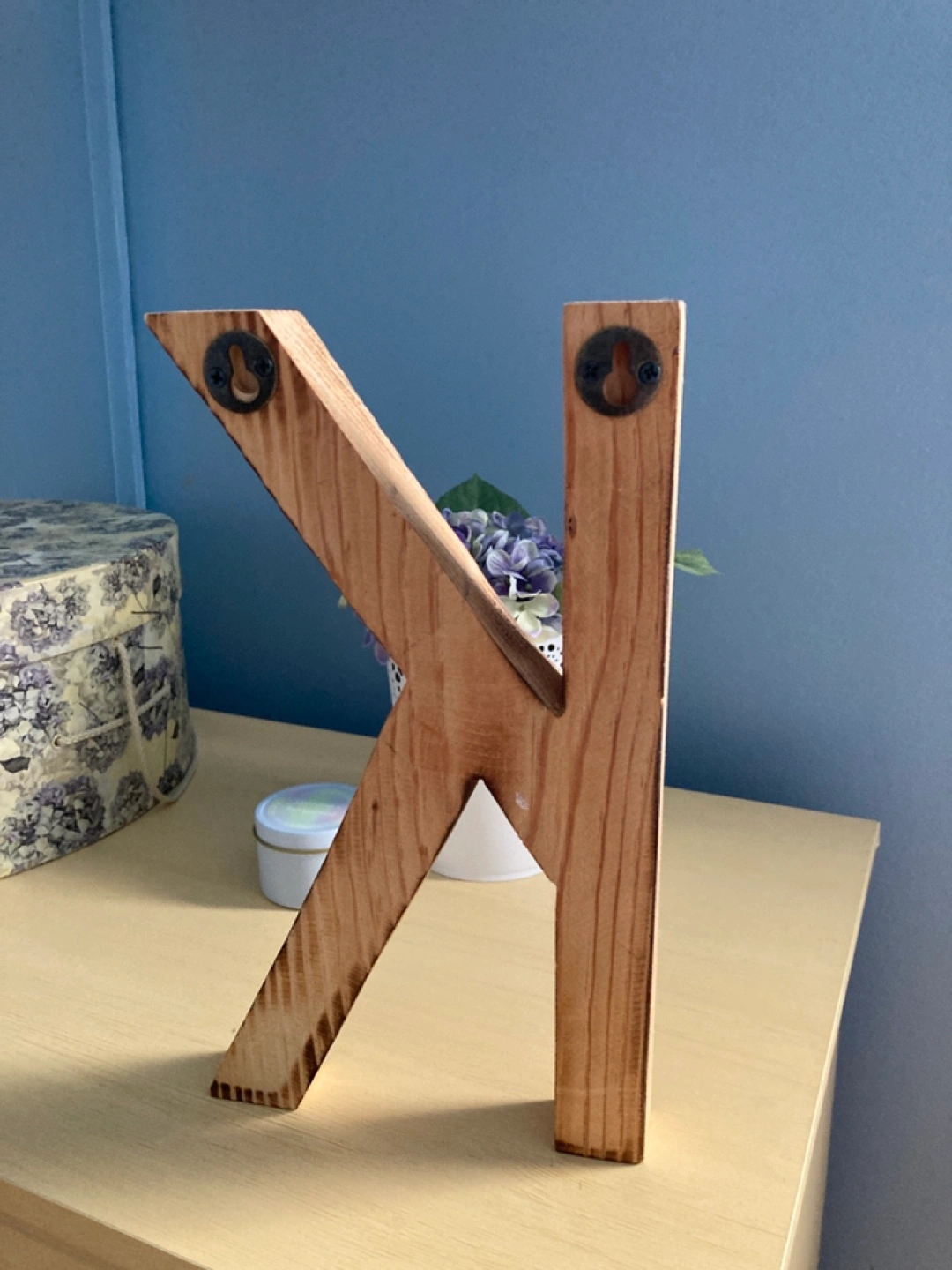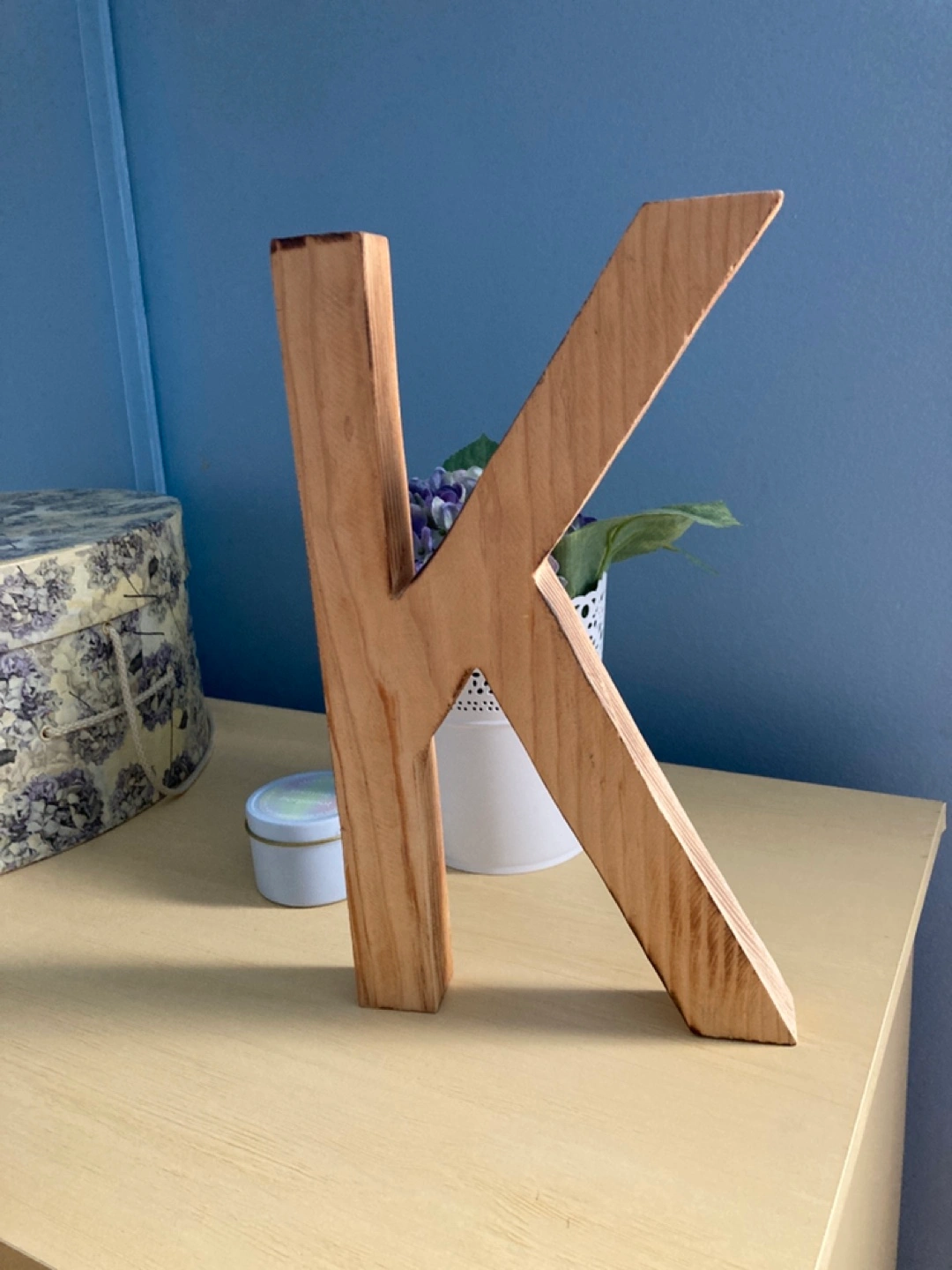 Large wooden letter K. Free-standing or wall-mountable. Rustic style. Perfect for home decor.