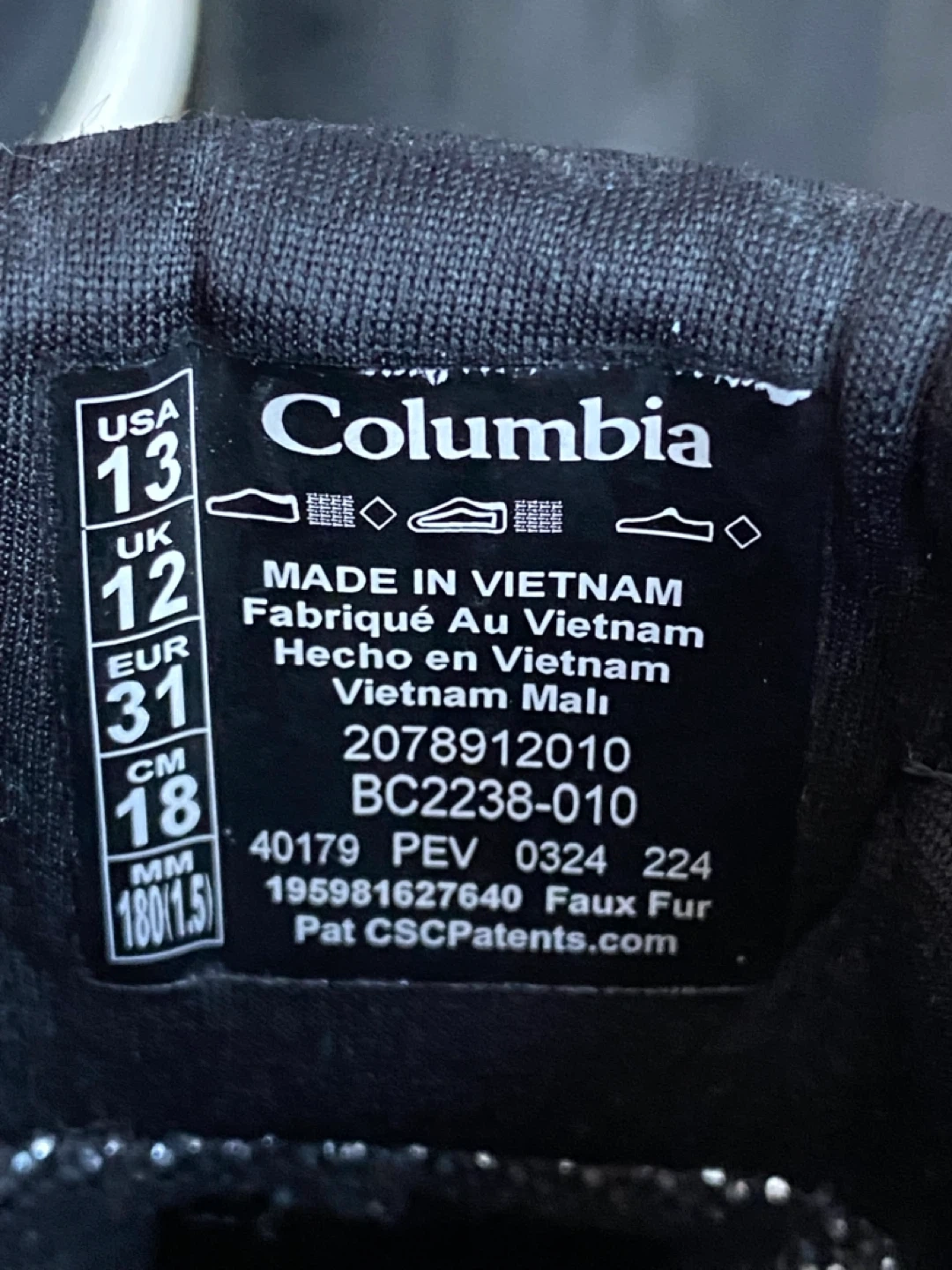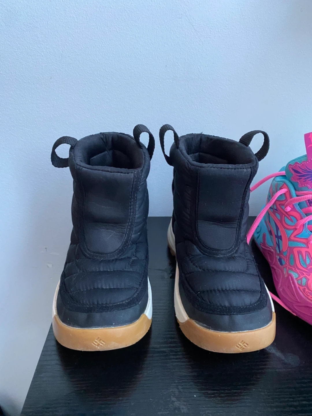 Columbia black puffer winter boots. Toddler size 13 (EUR 31, UK 12, CM 18). Easy pull-on tabs at the front and back. Rubber sole for traction.