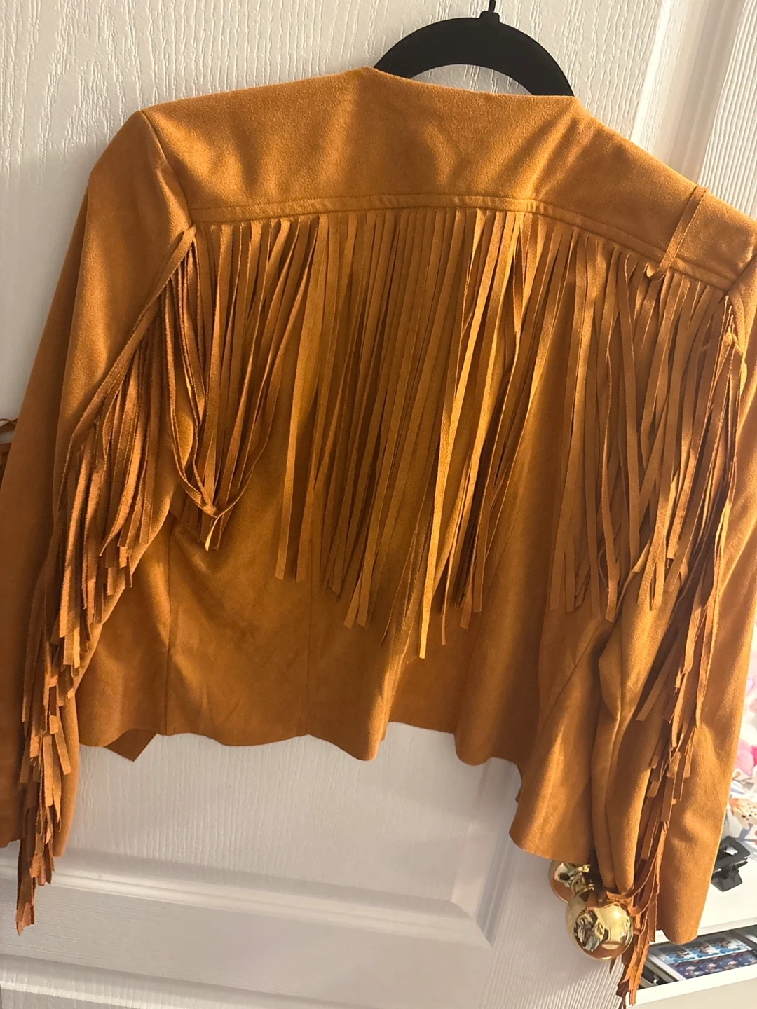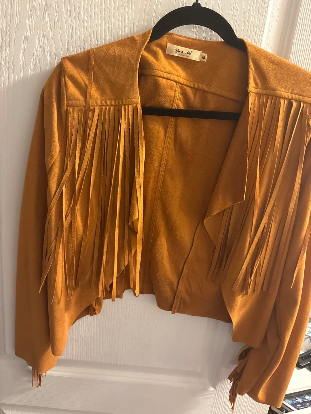 This stylish brown jacket features a faux suede material with fun fringe accents on the front and back. It's a size medium with an open front design. This piece adds a cool boho vibe to any outfit! Good for Halloween!