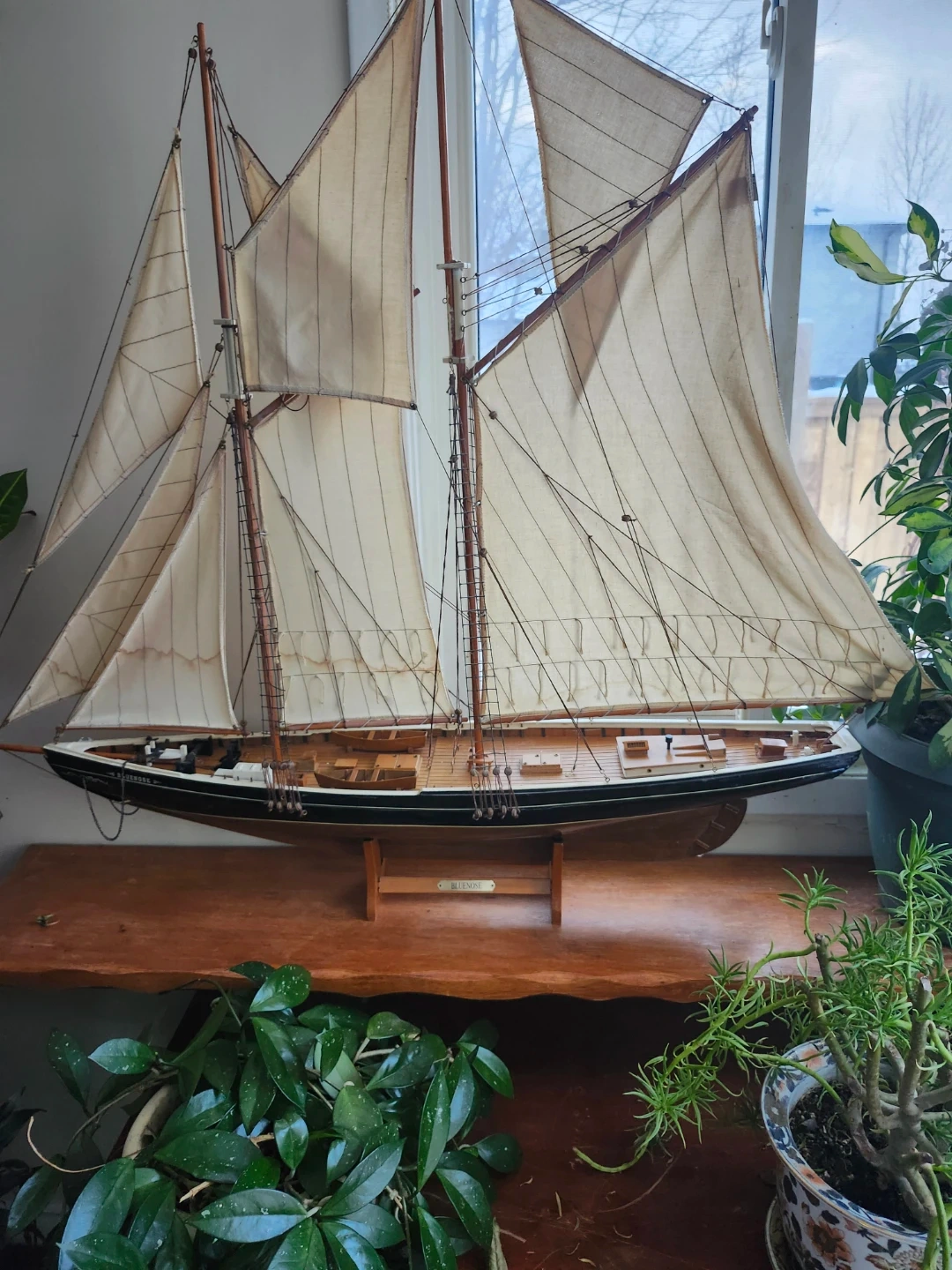 Selling a Bluenose model sailboat, perfect for adding a nautical touch to your home decor! It's a beautiful piece that would look great on a shelf or desk.