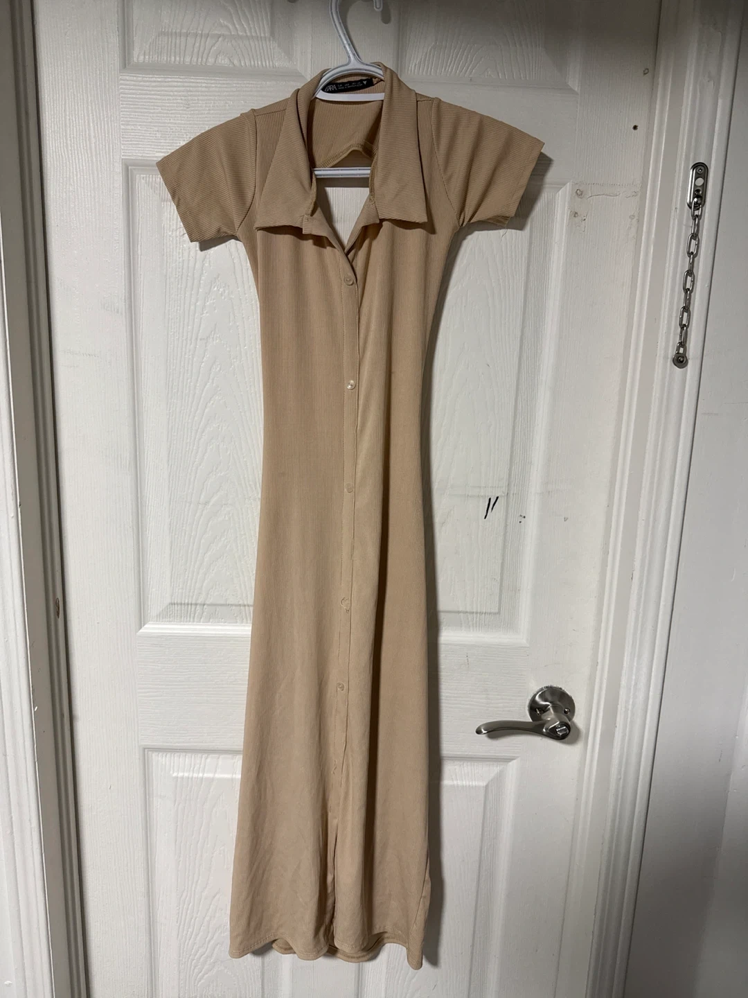 Tan ribbed button-up maxi dress. Short sleeves and a collared neckline. Features a cut-out back detail with a tie closure. Made from a comfortable stretch fabric.