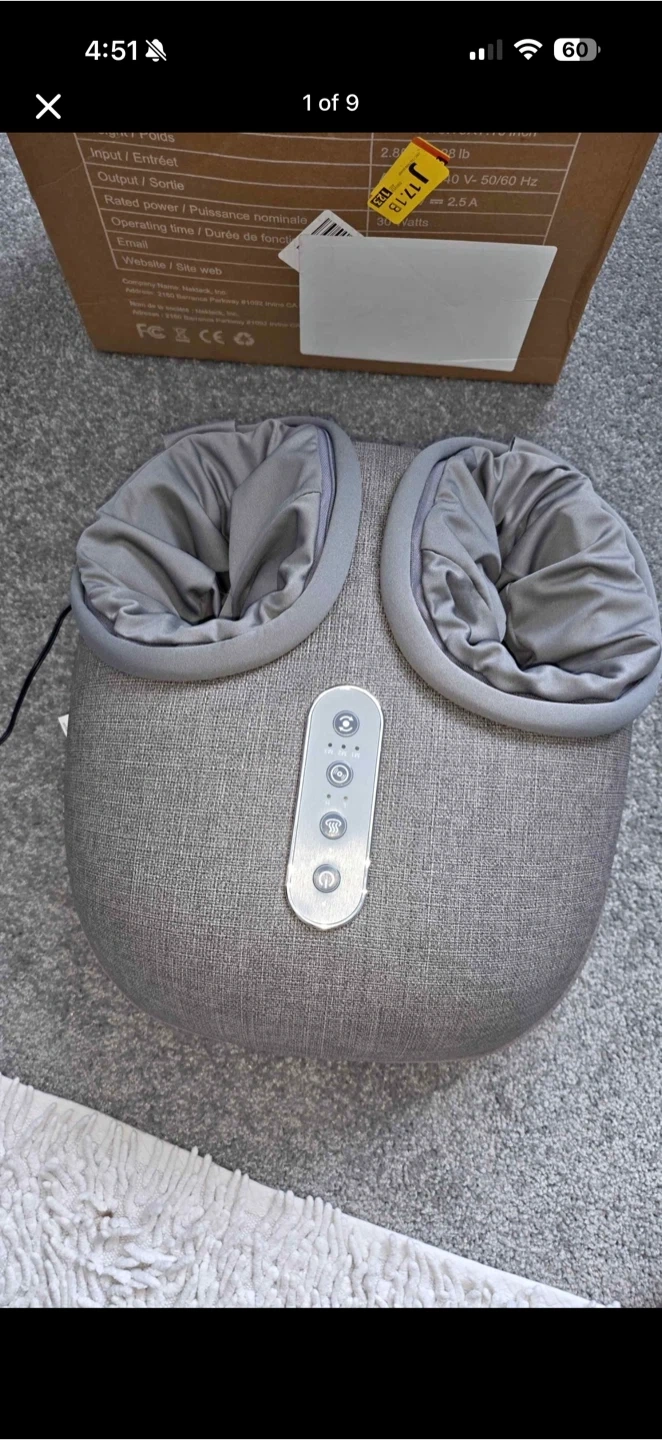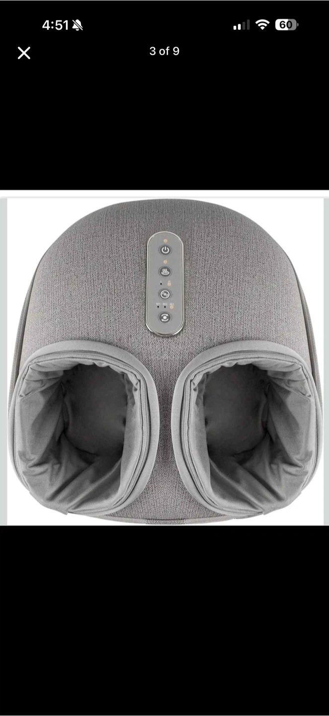 It's a grey foot massager with a cloth-like PU material housing. It features detachable and washable foot covers, 4 soft non-slip feet, and a 15-minute auto-off timer. The massager has power on/off, heat button, and adjustable air intensity.