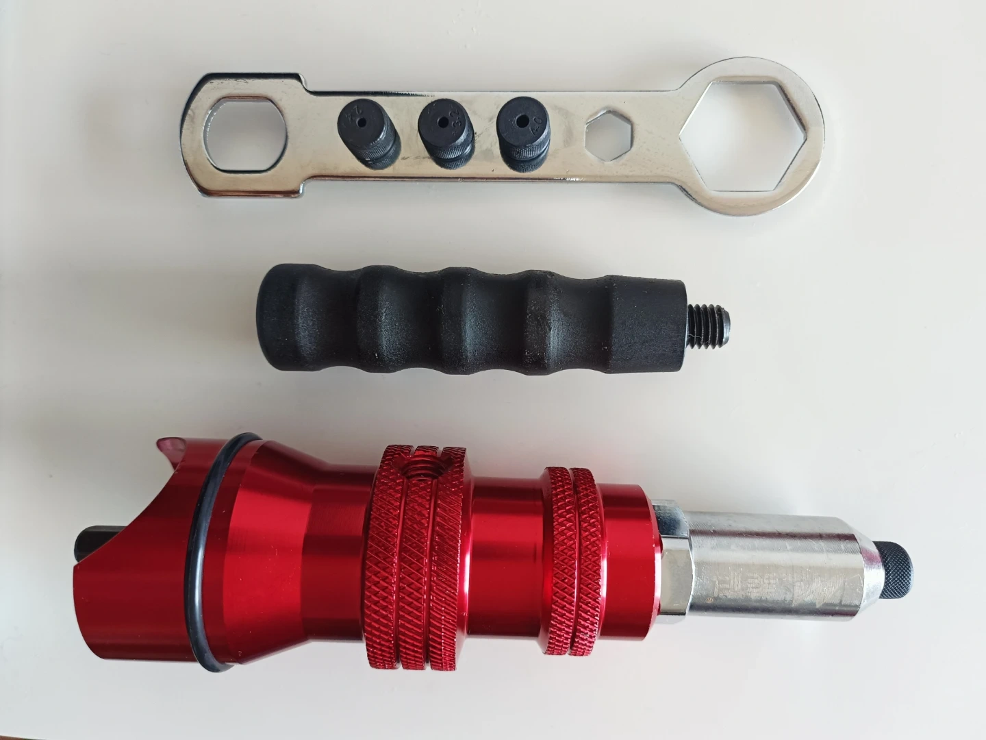 This set includes a red riveter tool with a black handle and a wrench. It's designed for riveting applications. The tool is made of metal with a rubber grip on the handle.