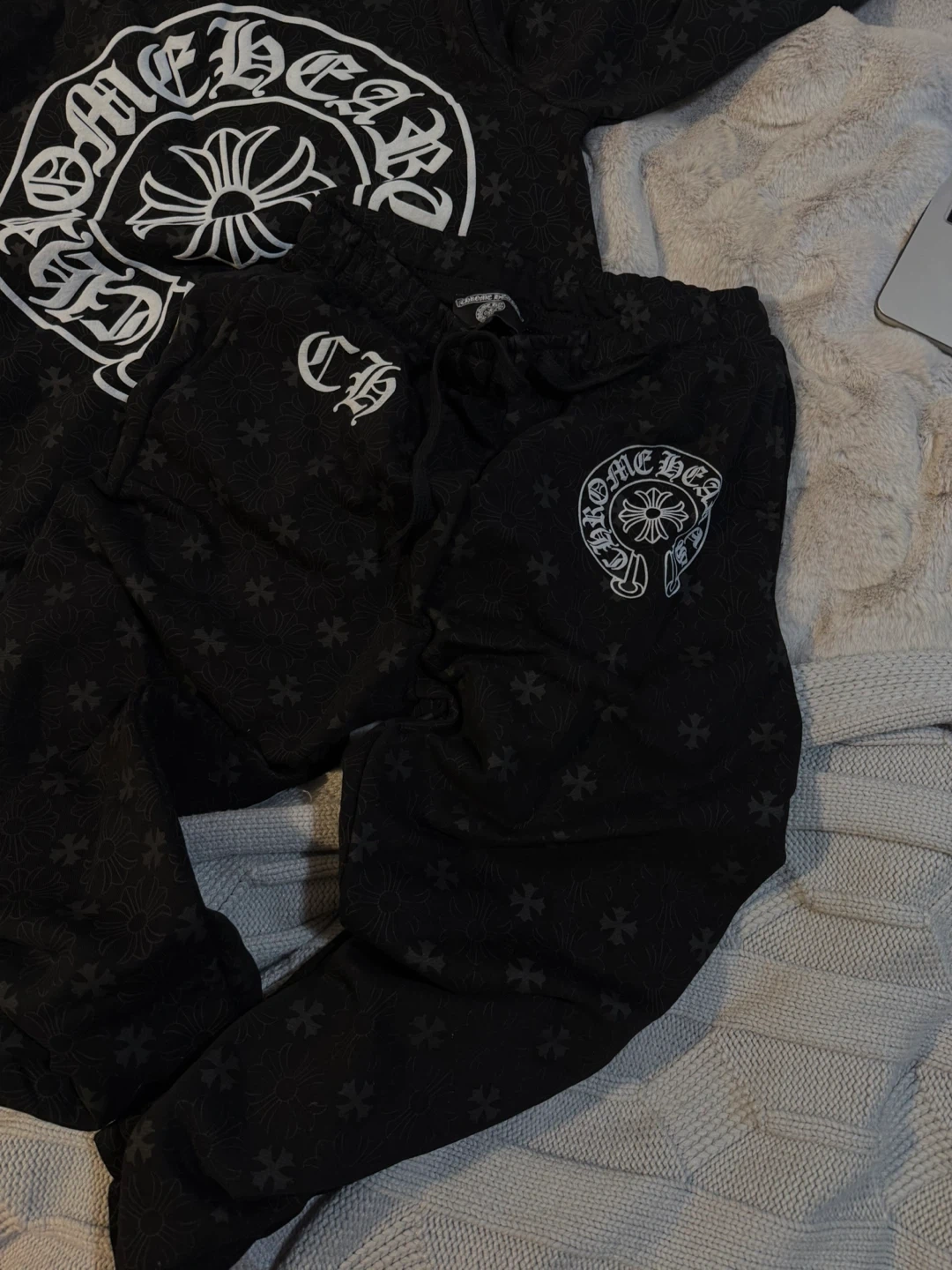 This is a Chrome Hearts black hoodie and joggers set with a repeating floral cross print. The hoodie is size small and has the signature Chrome Hearts logo on the back. The joggers also feature the all-over print and a drawstring waist. Includes Farfetch packaging.