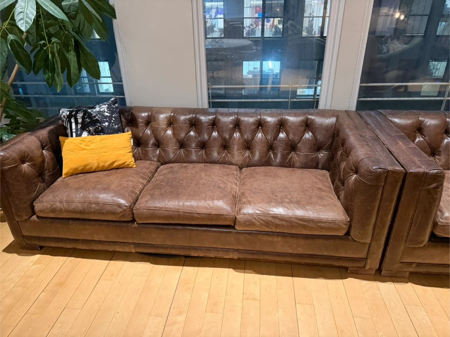 This is a classic Chesterfield sofa upholstered in distressed brown leather. It features deep button tufting on the back and arms, with plush seat cushions. It's a substantial piece of furniture that adds a touch of vintage style to any living space.