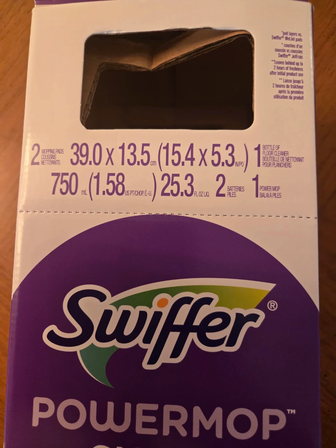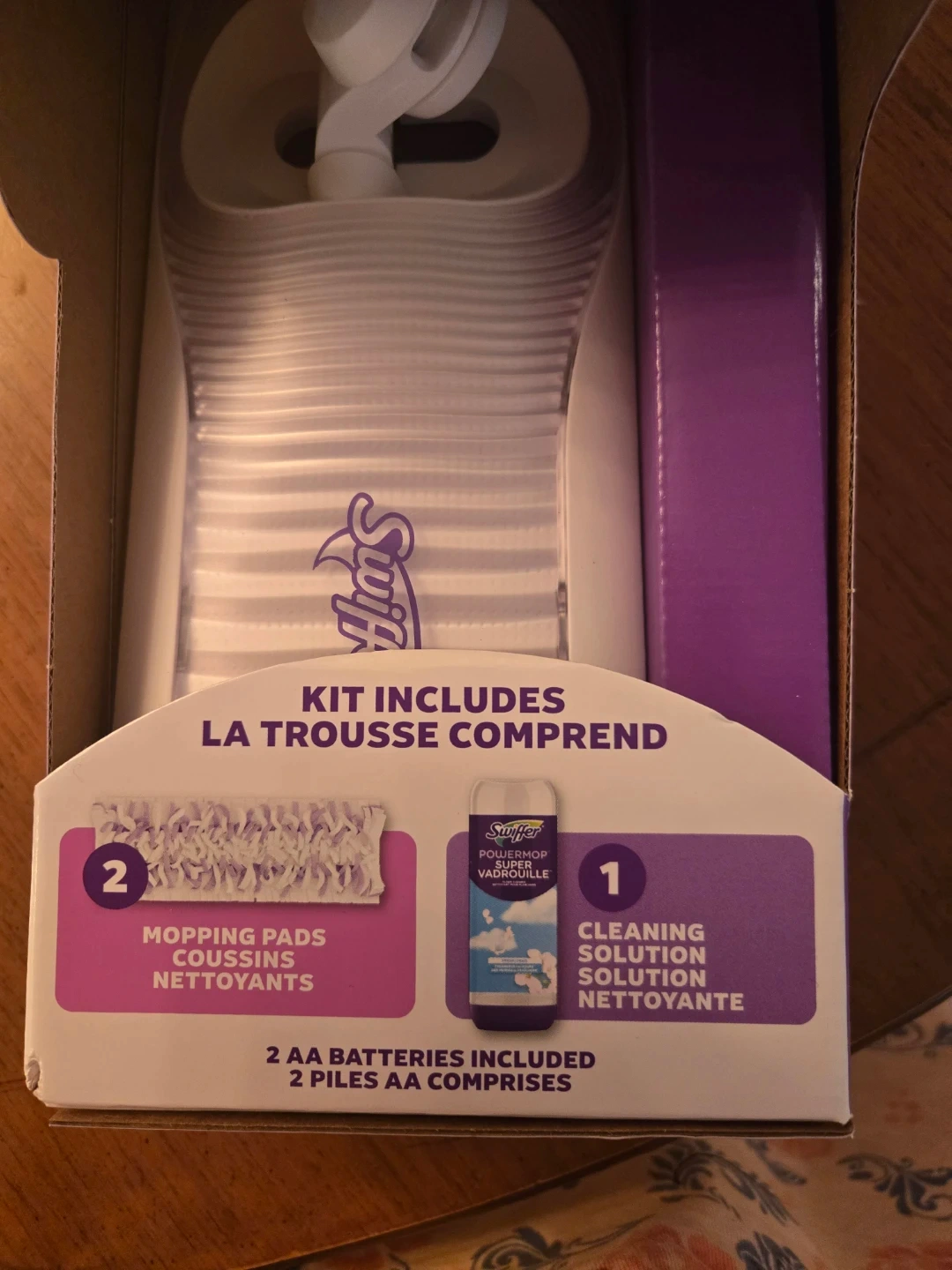This Swiffer PowerMop kit includes the mop, 2 mopping pads, a bottle of cleaning solution, and 2 AA batteries. It's designed for multi-surface cleaning. The mop offers 5X cleaning power with scrubbed strips.