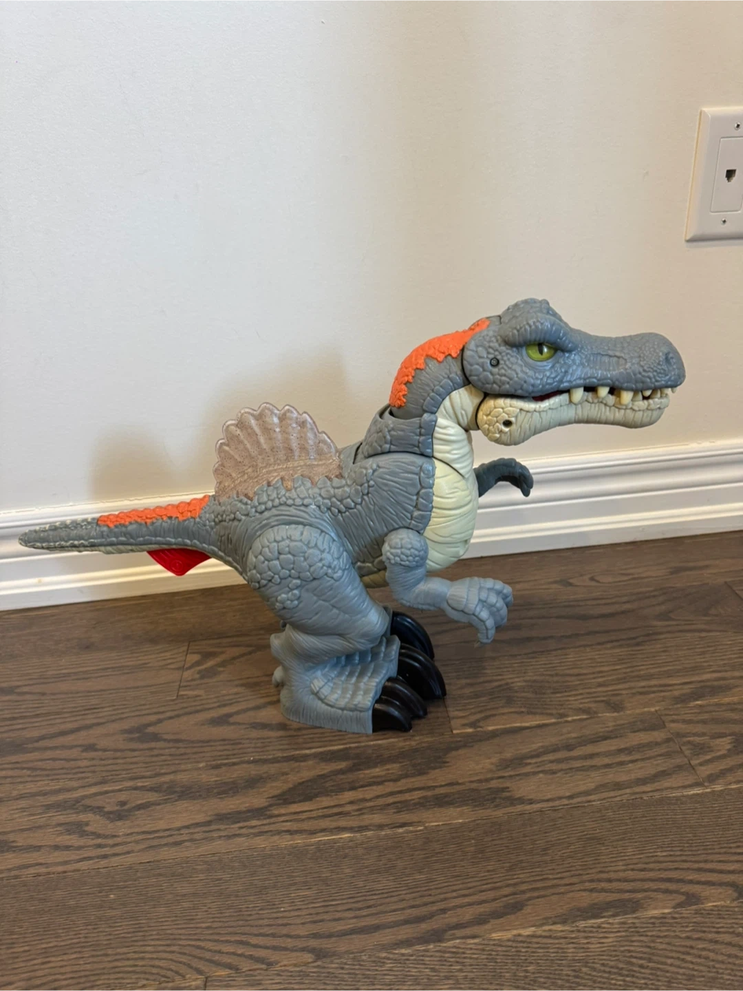 This is a grey and orange dinosaur toy with light-up features. It has yellow eyes that glow and blue lights on its back fin. The dinosaur's mouth opens and it has textured skin detail.