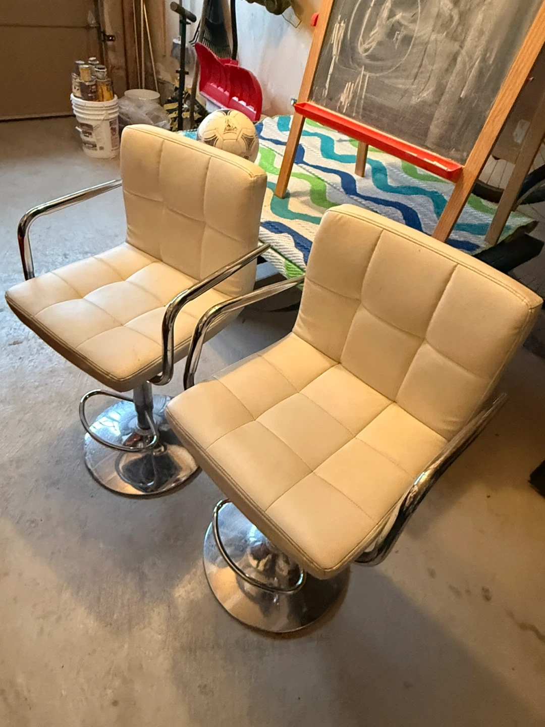 Selling a set of two cream-coloured, faux leather bar stools. They swivel and have adjustable height. The square seats are tufted and have chrome armrests and bases. These stools would be great for a kitchen island or home bar!