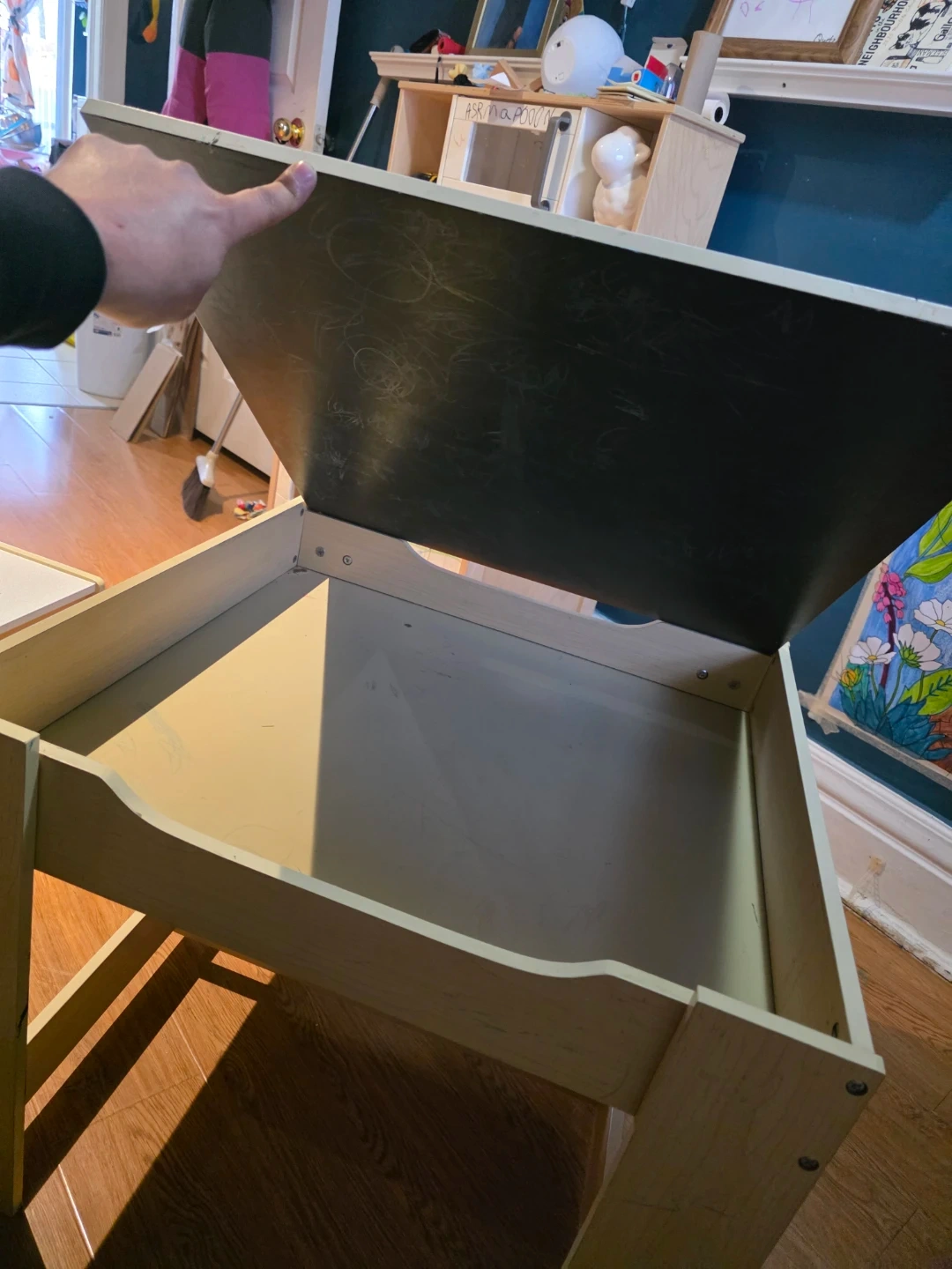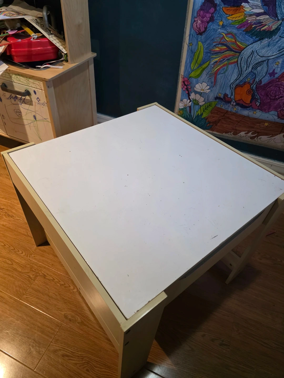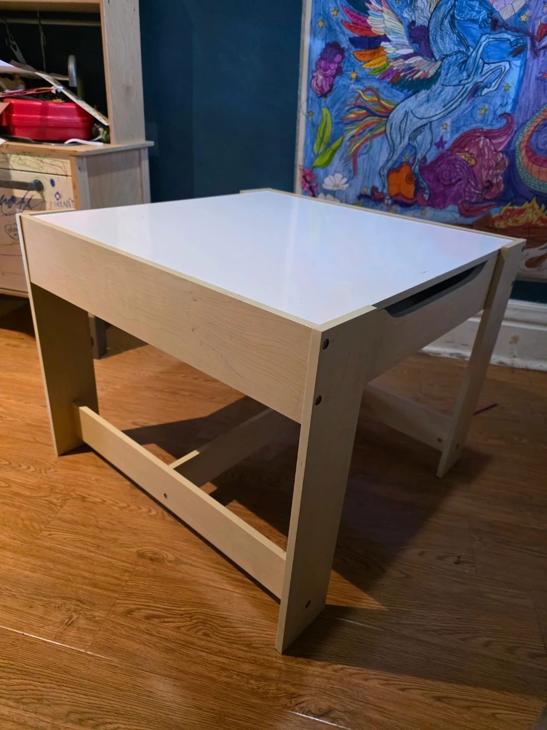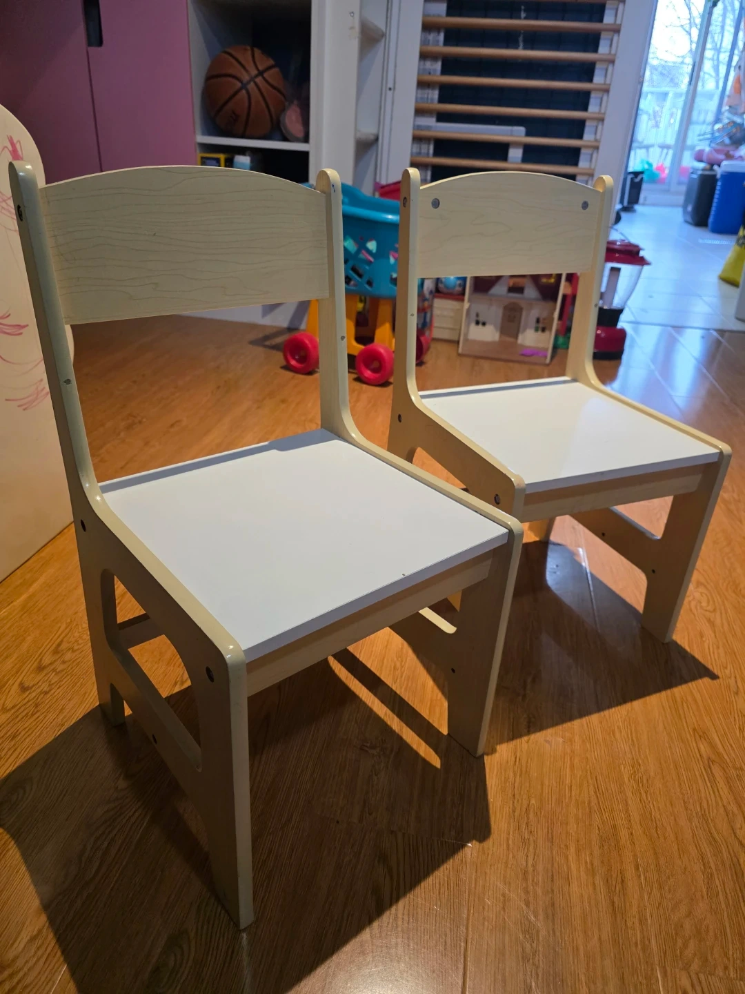 This set includes a sturdy wooden table with a white surface and two matching chairs. The table also has a flip-up chalkboard surface for drawing. It's perfect for arts and crafts or playtime. 48.5 cm height, 62 x 62 cm.