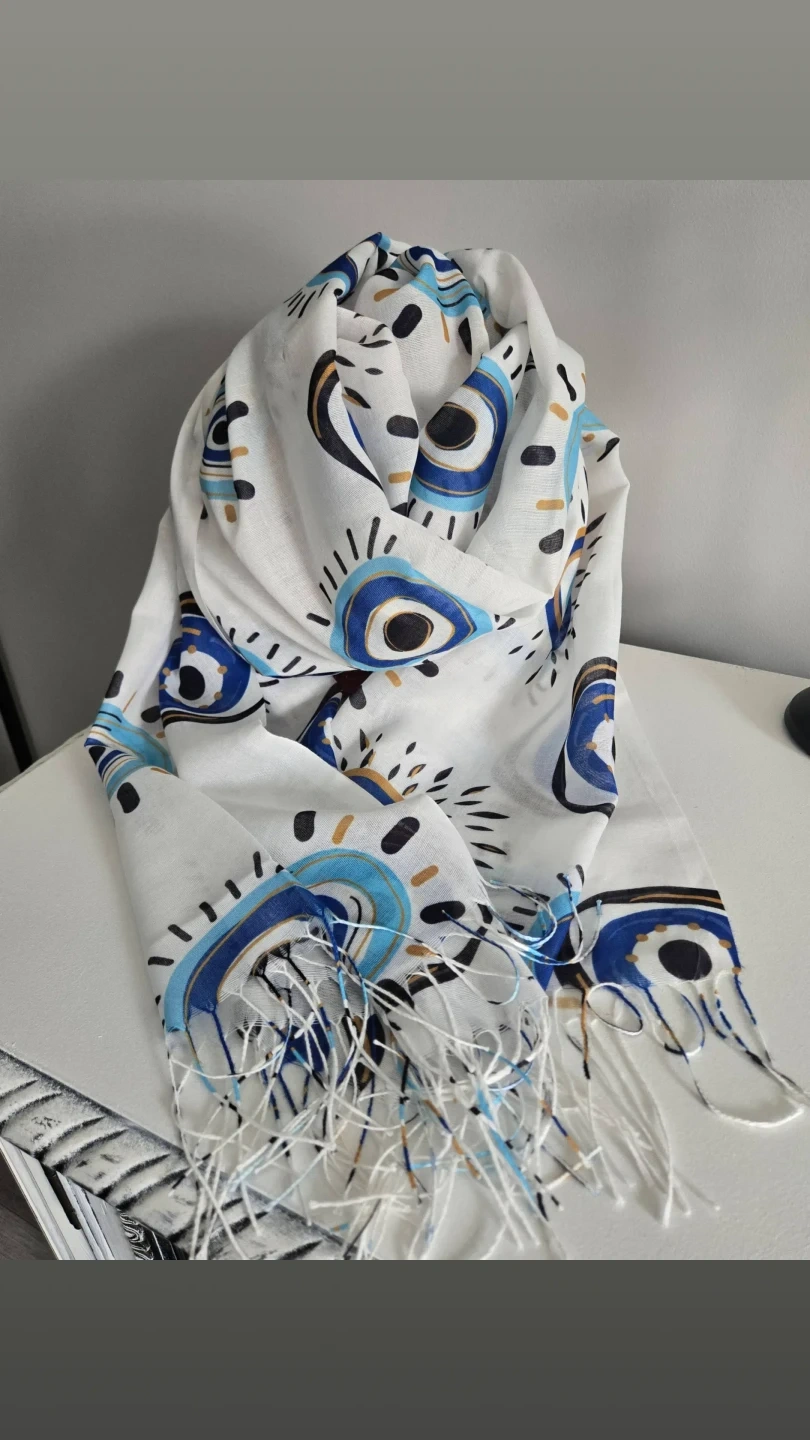 A white scarf featuring a vibrant evil eye print in blue. It has a fringe detail on the ends. This scarf's eye-catching design makes it a unique accessory. It's lightweight and drapes beautifully.