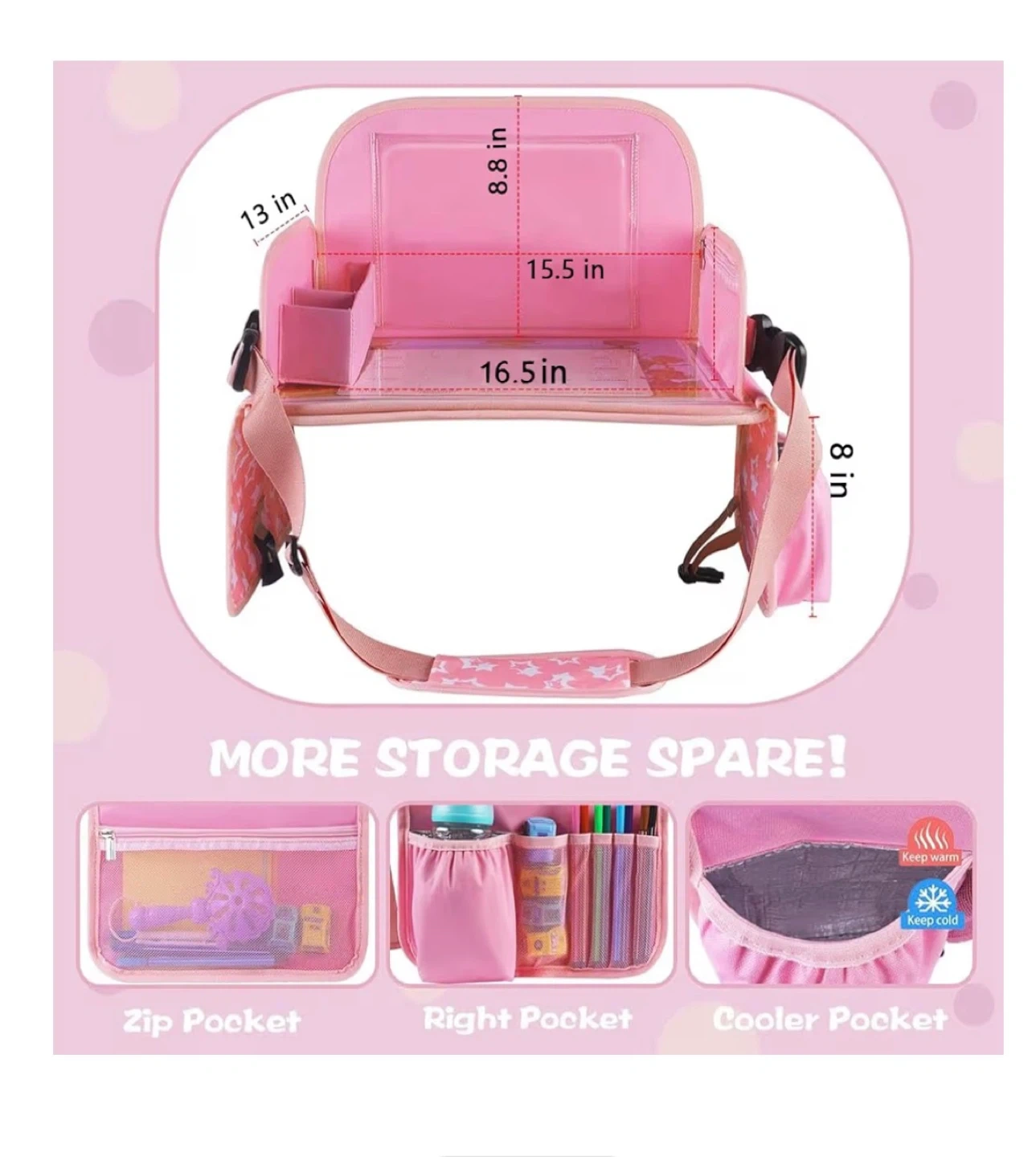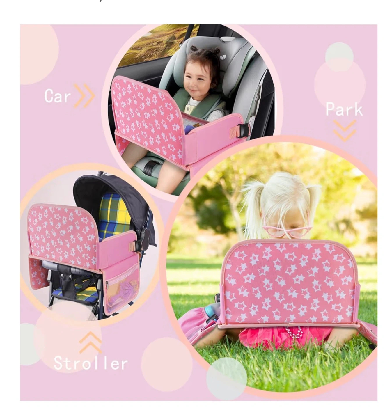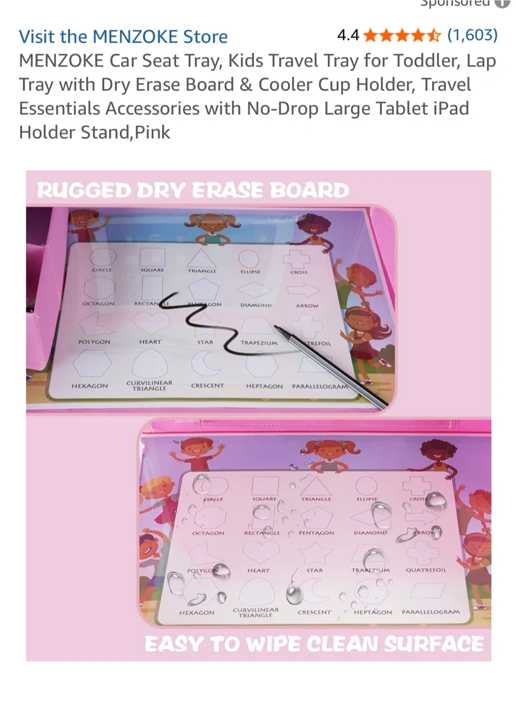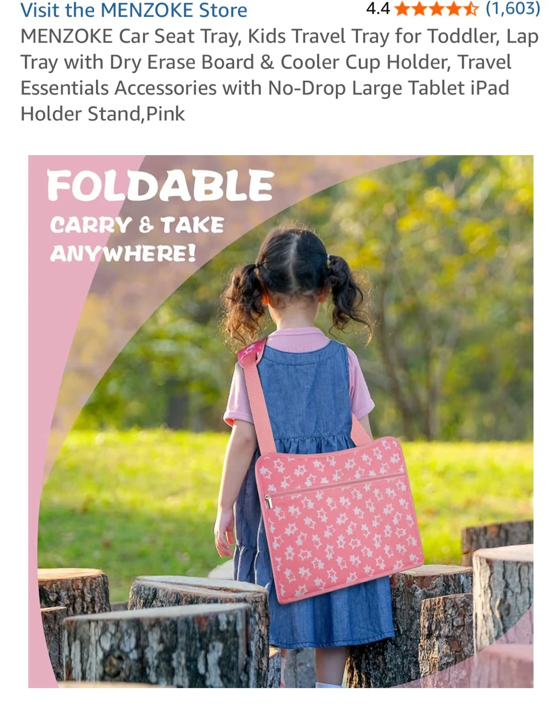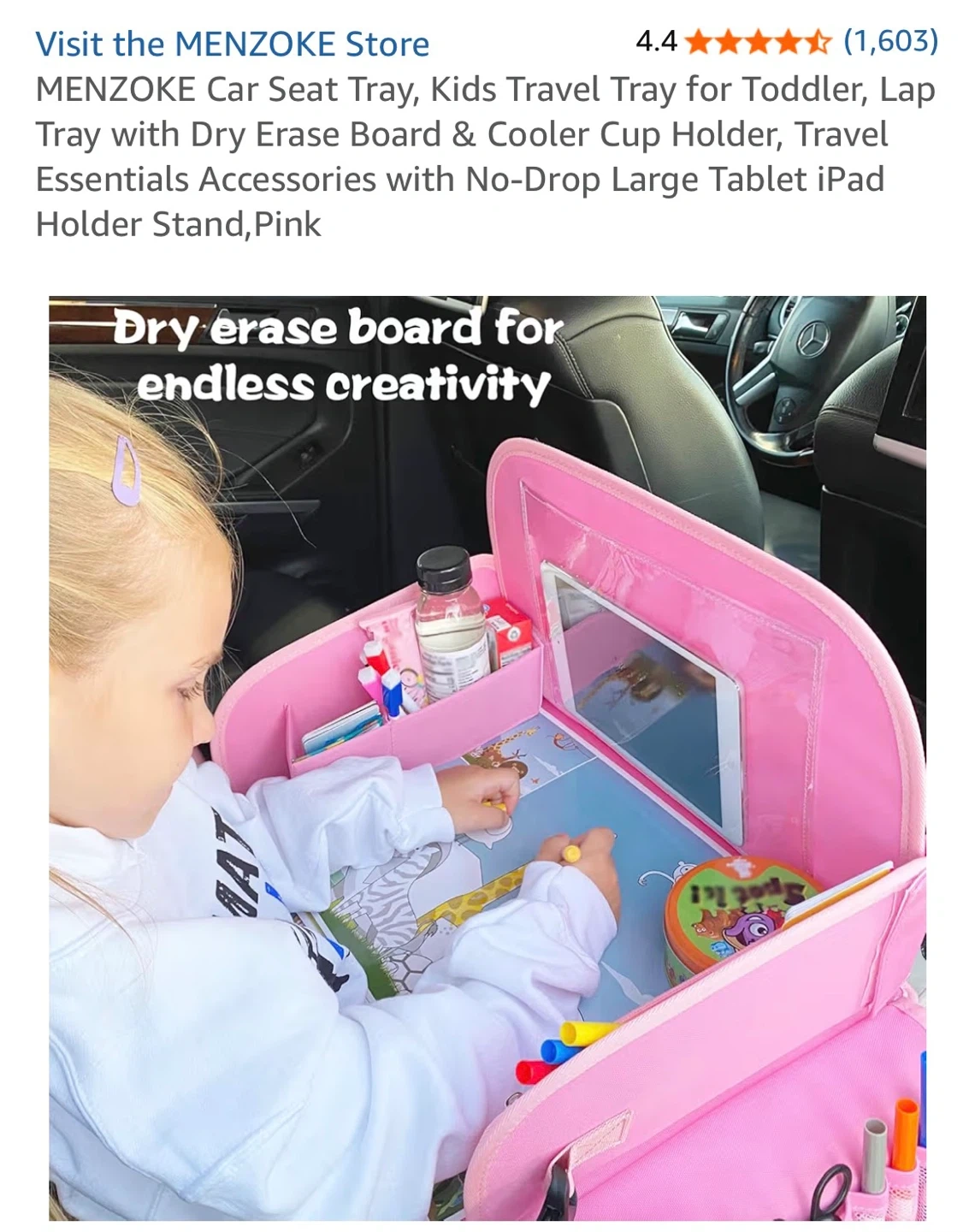 This MENZOKE travel tray is perfect for keeping little ones entertained on the go. It features a dry erase board, cup holder, and tablet stand. The tray is foldable and portable, great for cars, strollers, or even picnics. It's designed for easy cleaning too!