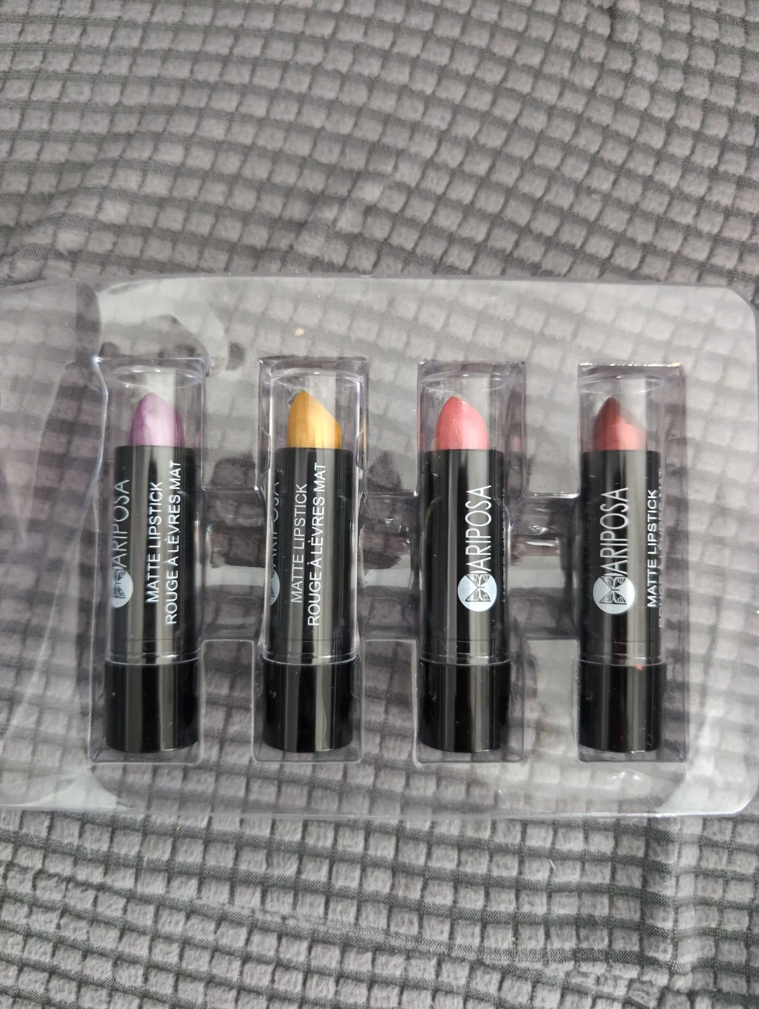 This is a set of four Pariposa matte lipsticks. The lipsticks come in purple, gold, pink, and red shades. Willing to sell lipsticks individually. $1 per lipstick