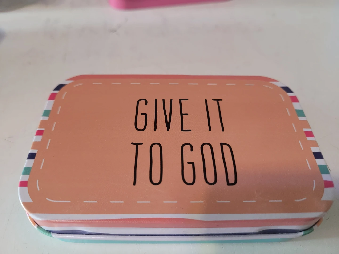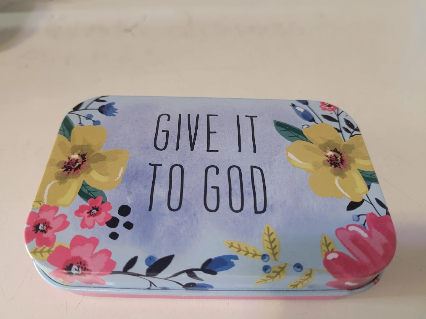 This prayer box features uplifting scriptures like Luke 1:45 and Exodus 15:26 inside the lid. It includes a blue pen and blank cards for writing prayers. The tin has a floral design on the outside with the phrase "Give It To God".
