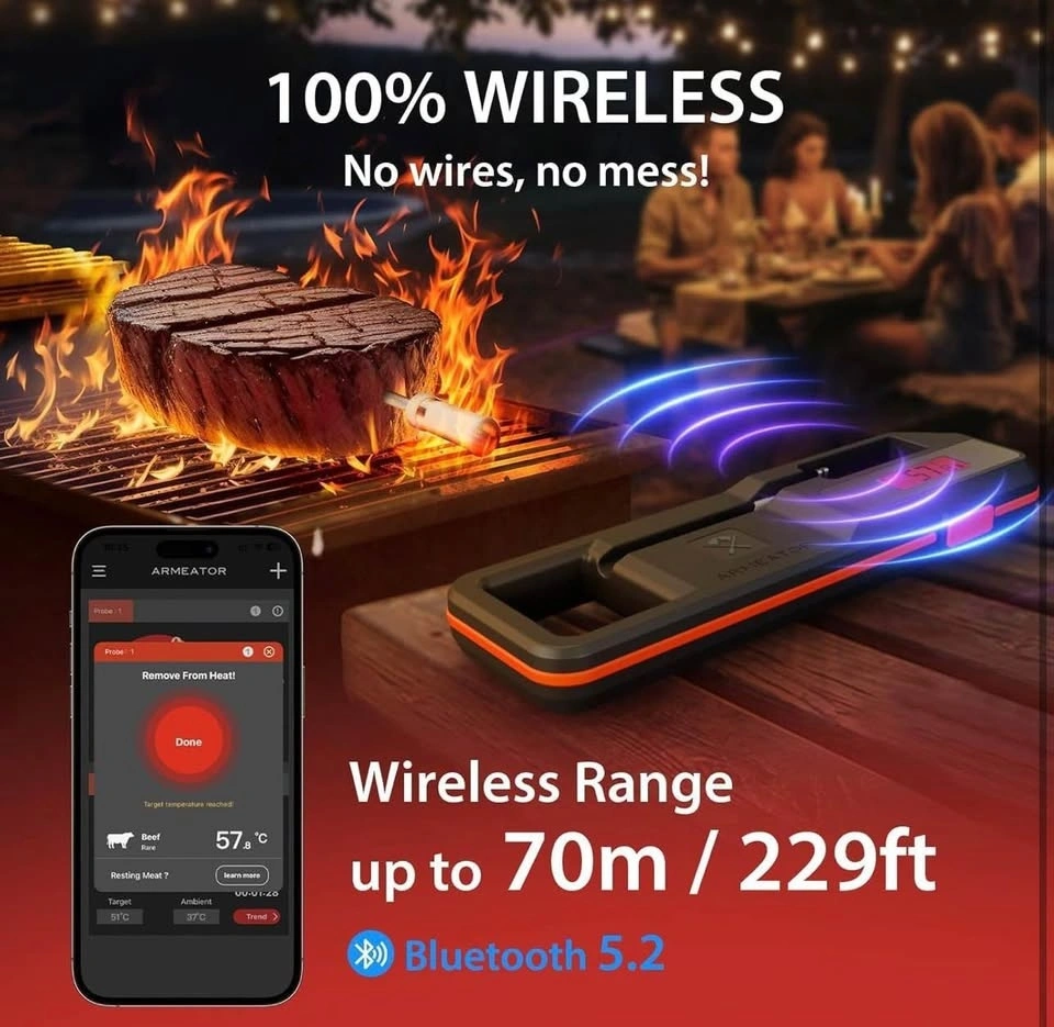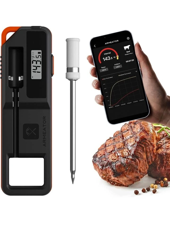 This digital meat thermometer is great for BBQ, baking, meats, liquids, and candy making. It works with air fryers, ovens, grills, smokers, and more. It's 100% wireless with Bluetooth LE 5.2, offering a range of up to 229ft (70m) and can be monitored via an app for iOS and Android. The instant-read probe is highly accurate (±0.9) with a 2-3 second response time and features a magnetic back. It has dual sensors to monitor both internal meat temperature (up to 212°F) and ambient/external temperature (up to 572°F) simultaneously. The app includes an algorithm to estimate cooking and resting times and a guided cook system with custom alerts. The included ABS dock charges the probe and holds it securely. The display has a bright backlight for easy reading in any light. It's a perfect gift for BBQ lovers, chefs, and home cooks.