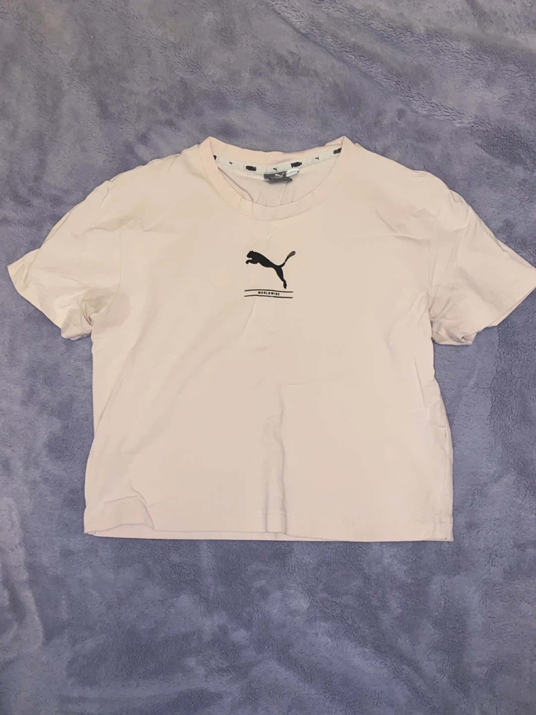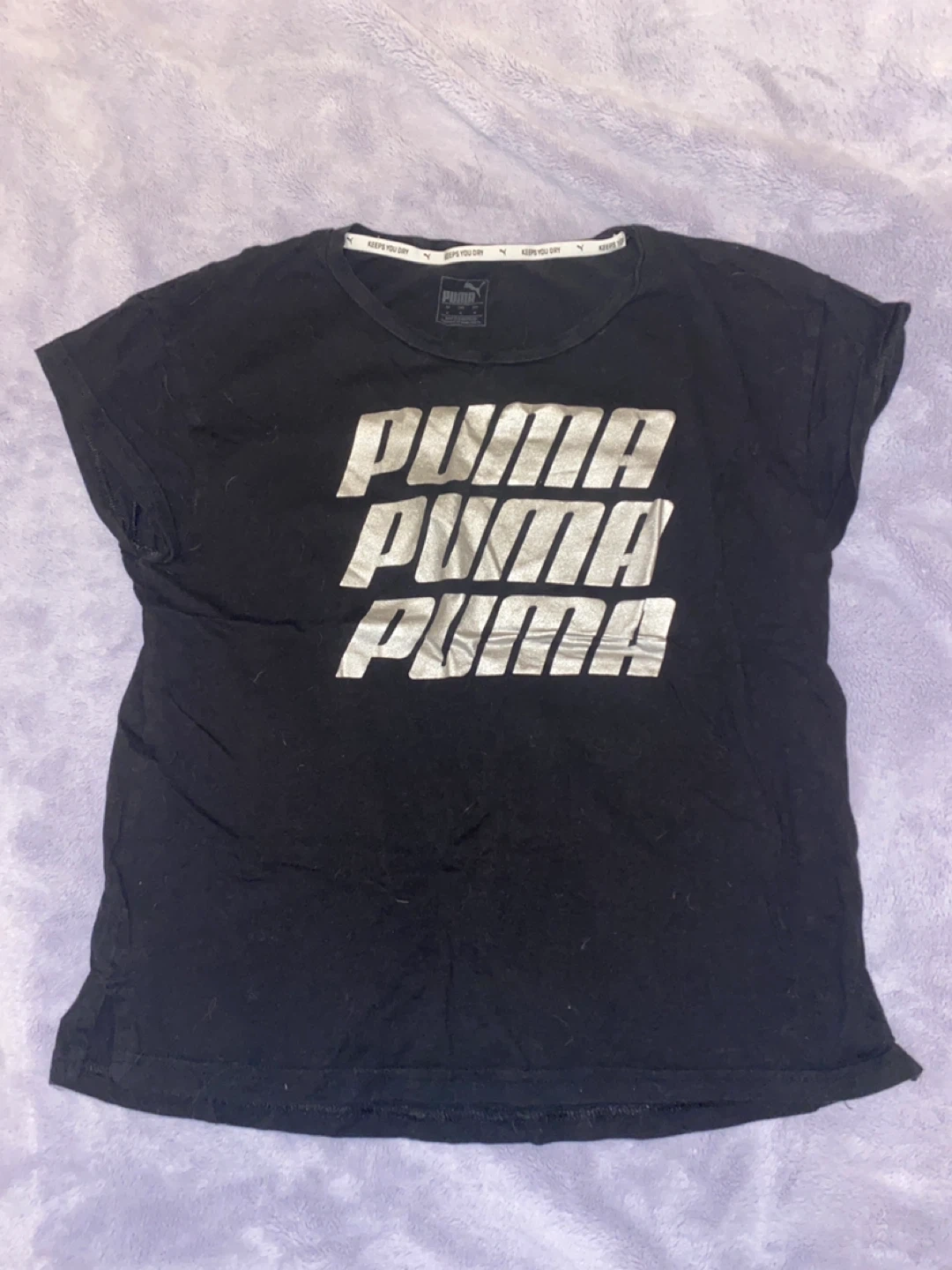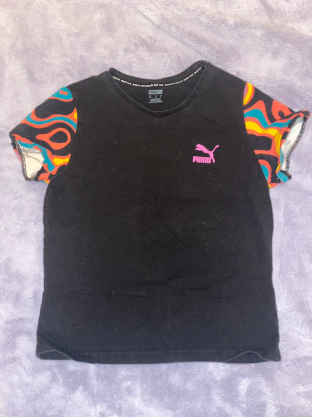 Bundle includes a black t-shirt with colourful sleeves, a black t-shirt with stacked Puma logos, a pink cropped shirt and a grey Puma cropped hoodie, a pink Puma cropped Hoodie. Plus an Ardene Black long sleeve.