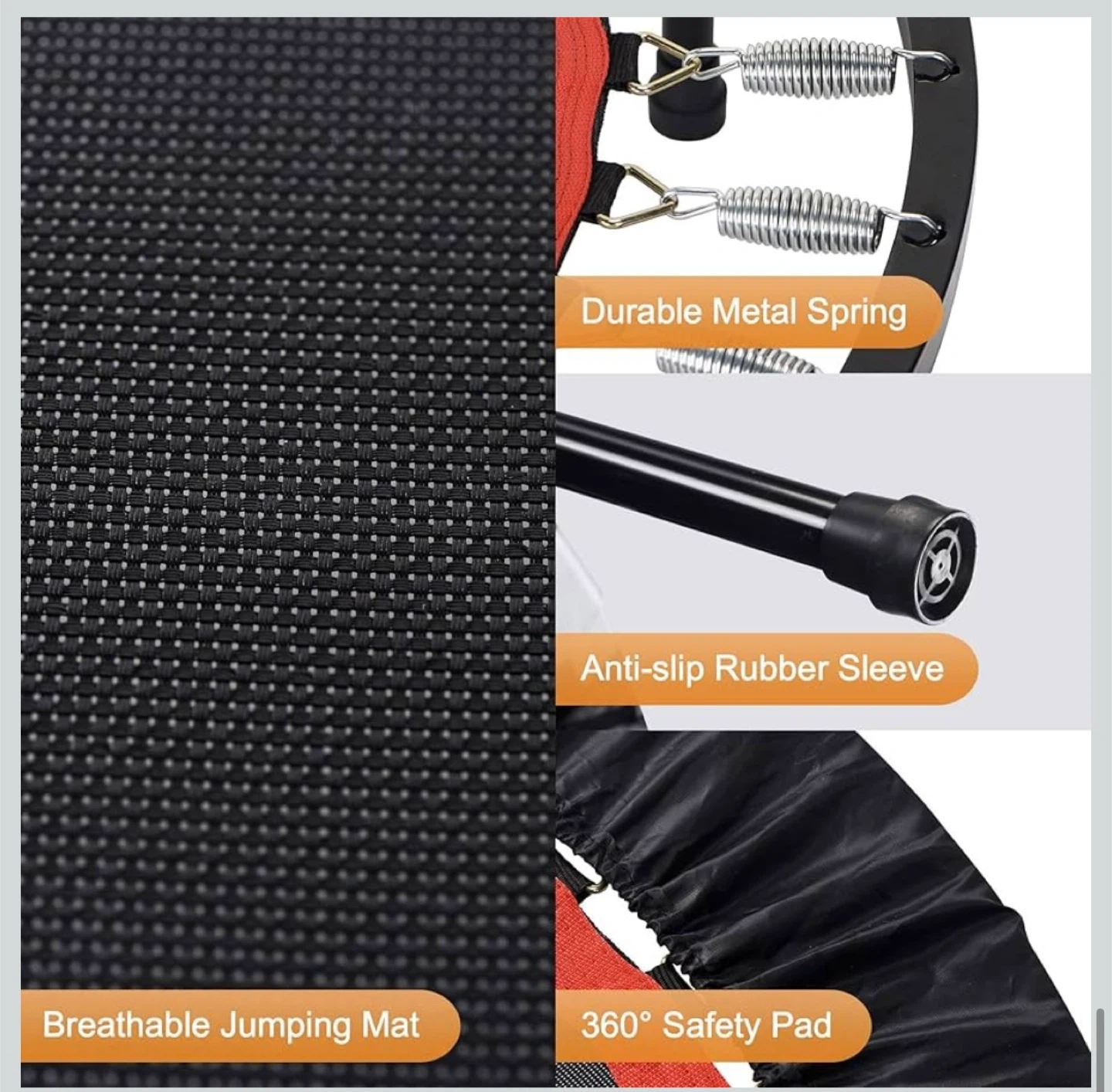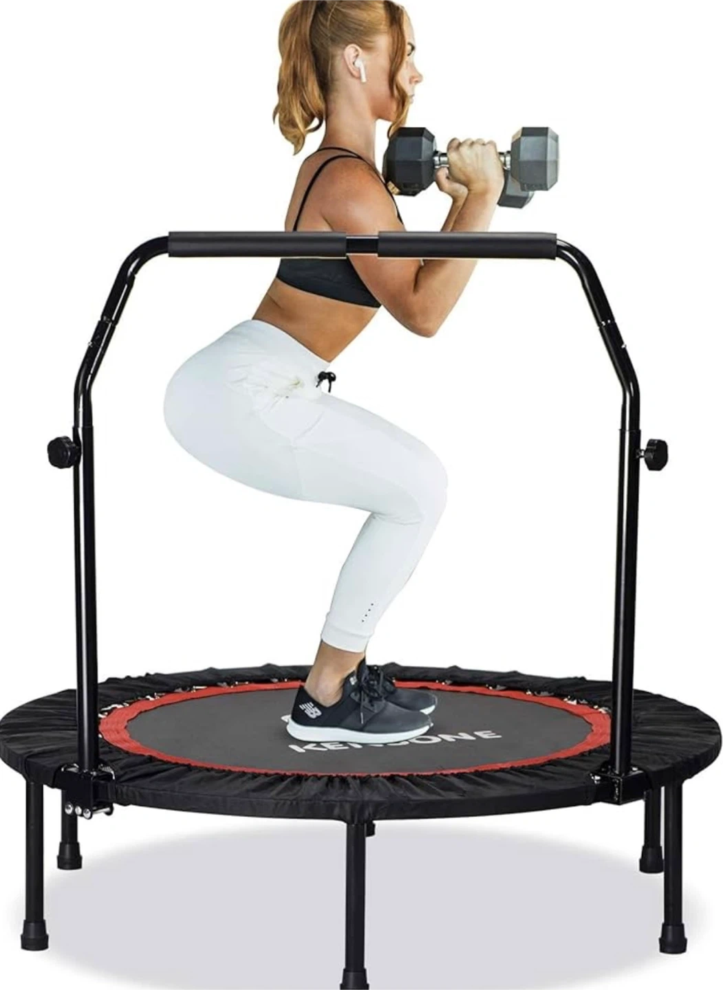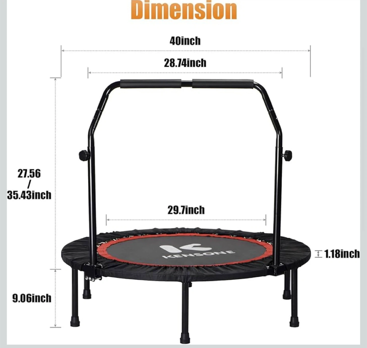 S This Kensone trampoline is foldable for easy storage. It features an adjustable handle with a foam grip for stability during workouts. The trampoline's diameter is 40 inches, with adjustable handle heights of 27.56 or 35.43 inches.