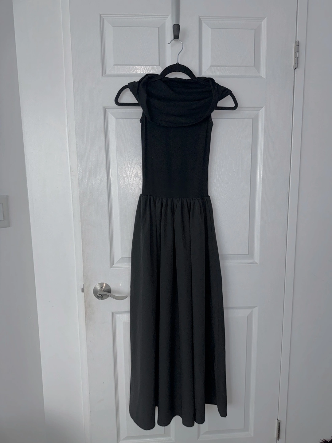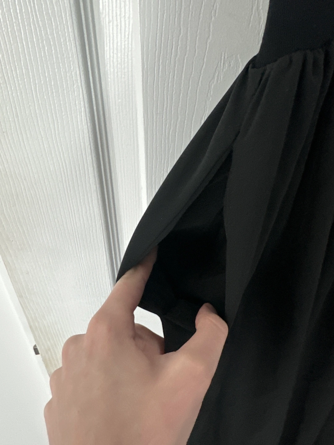 Elegant black maxi dress. iβm 5β6 for me it hits right above the ankle. Features off-the-shoulder neckline and a flowy skirt. Has pockets. Perfect for special occasions.