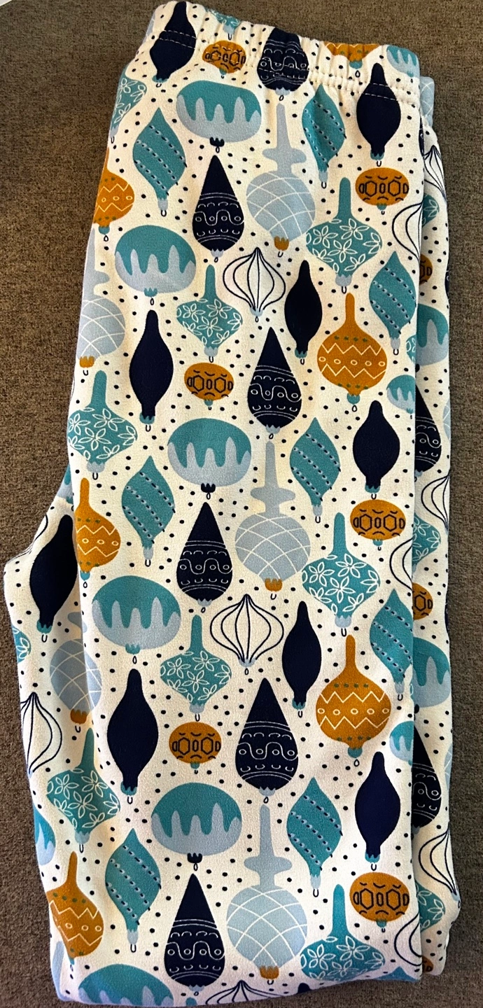 Fleece leggings with a festive ornament print. Size Medium/Large. Machine washable.