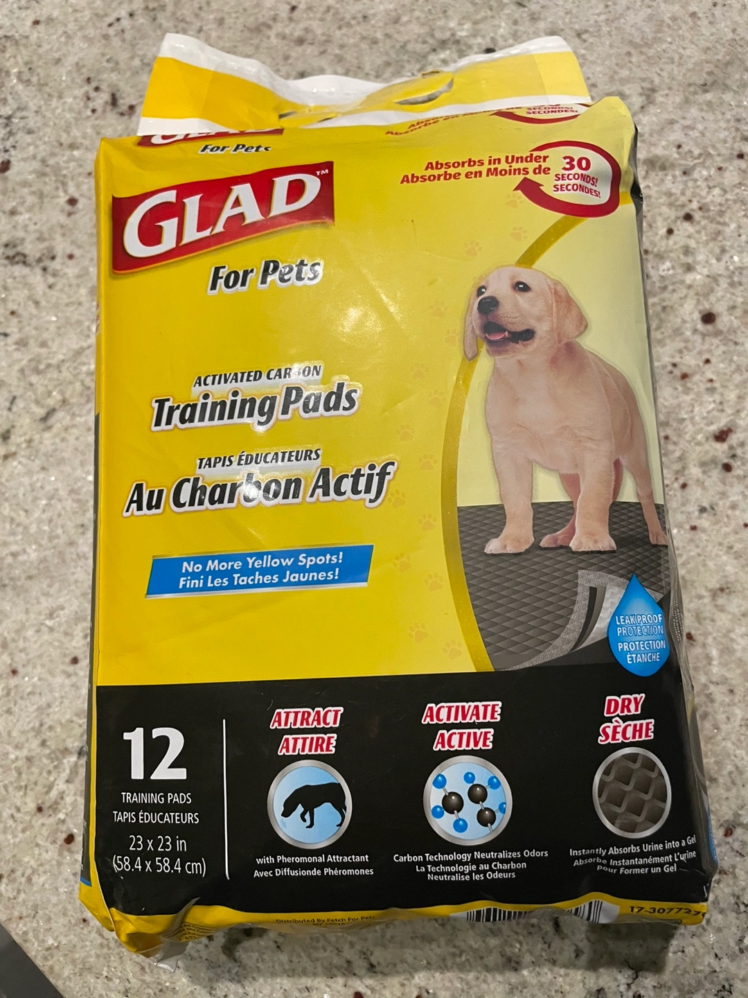 12 training pads. 23 x 23 inches. Absorbs quickly. Leakproof protection. Neutralizes odours. Pheromonal attractant.