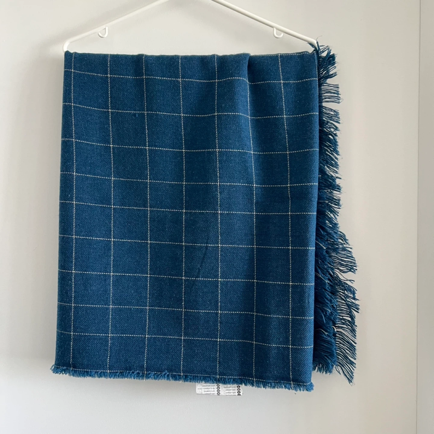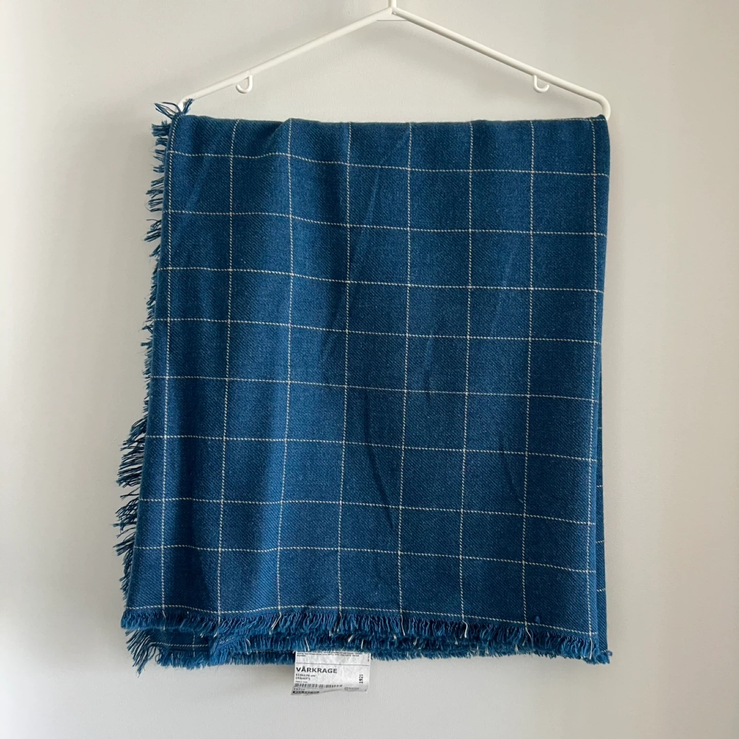 This is an IKEA VÄRKRAGE throw blanket, measuring 110x170 cm (43x67"). The blanket features a blue and white grid pattern with fringed edges. Great for adding a cozy touch to any room!