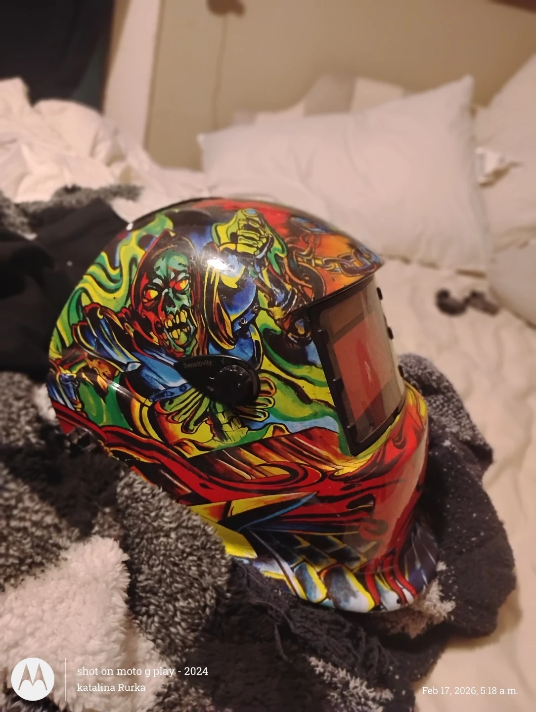 This auto darkening welding helmet features a vibrant, eye-catching graphic of skulls and flames. It's designed for comfort and protection during welding. Suitable for hobbyists and professionals alike!