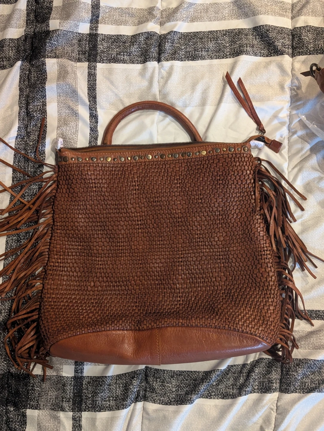 Selling a stunning premium genuine leather woven handbag in a rich cognac brown tone. Crafted with an intricate woven finish and elegant fringe detailing, this bag has a refined boho luxe aesthetic that instantly elevates any outfit.