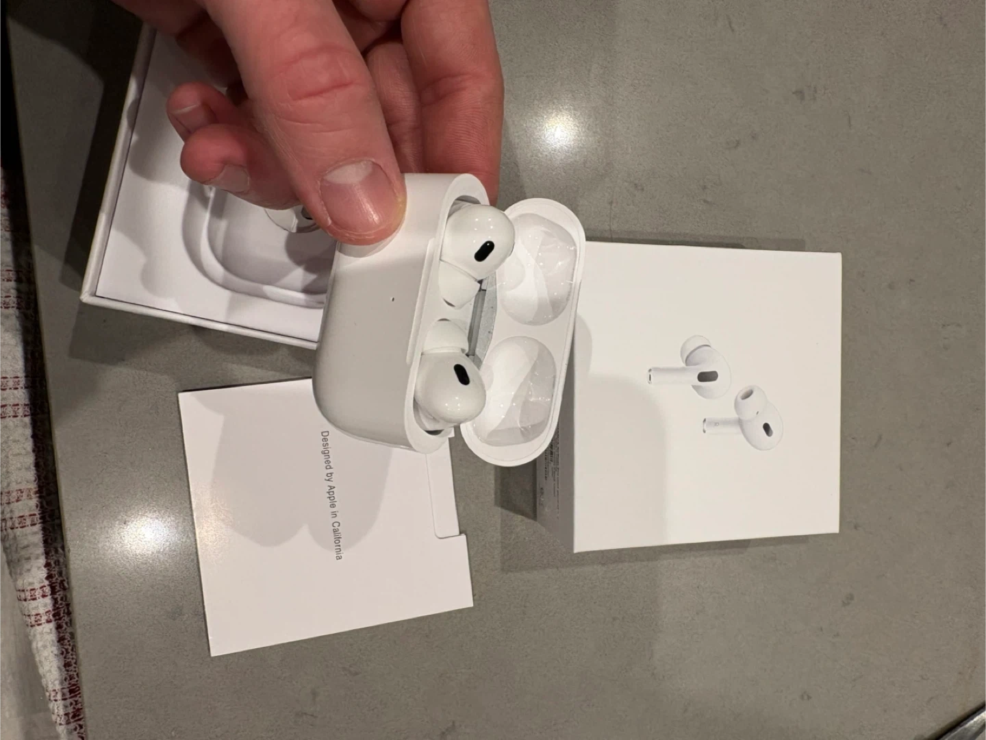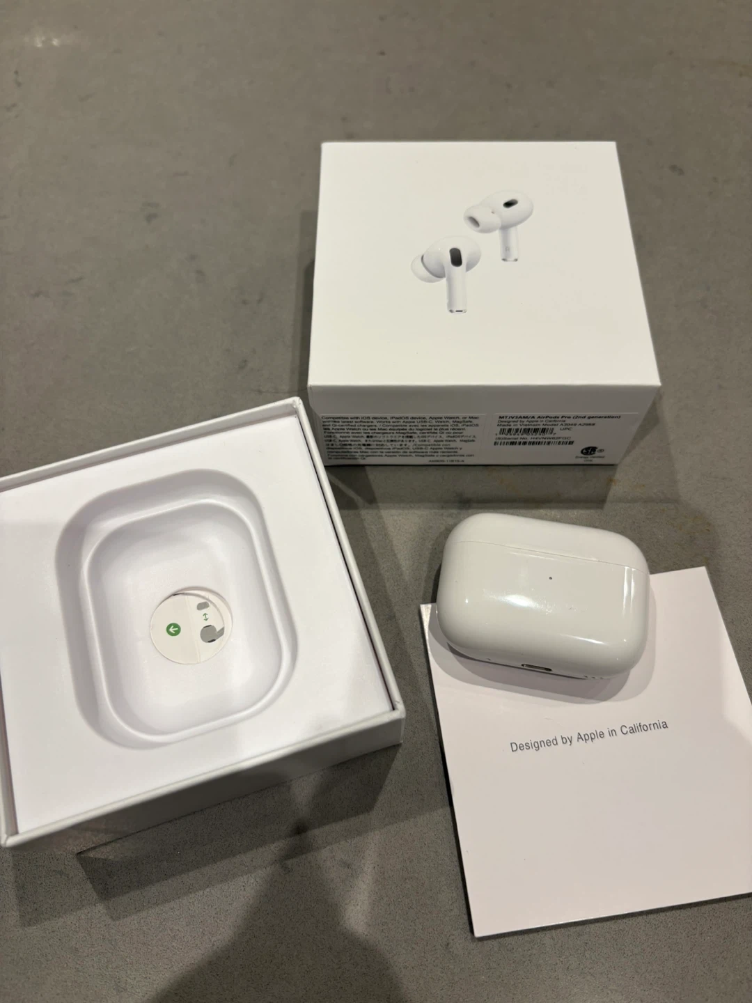 These are the Apple AirPods Pro (2nd generation). They come with the MagSafe Charging Case. It includes the AirPods, charging case, charging cable, and documentation. Designed by Apple in California.