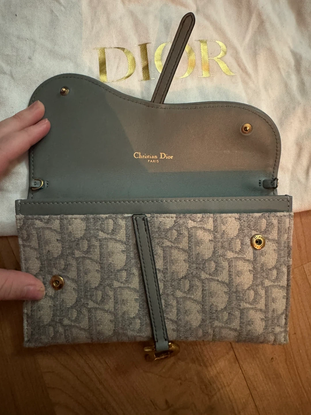 Stunning Dior Saddle Pouch with chain crafted in iconic gray Dior Oblique jacquard. A beautiful hybrid piece with a modern, streamlined silhouette and timeless luxury design. Elegant, versatile, and collectible.