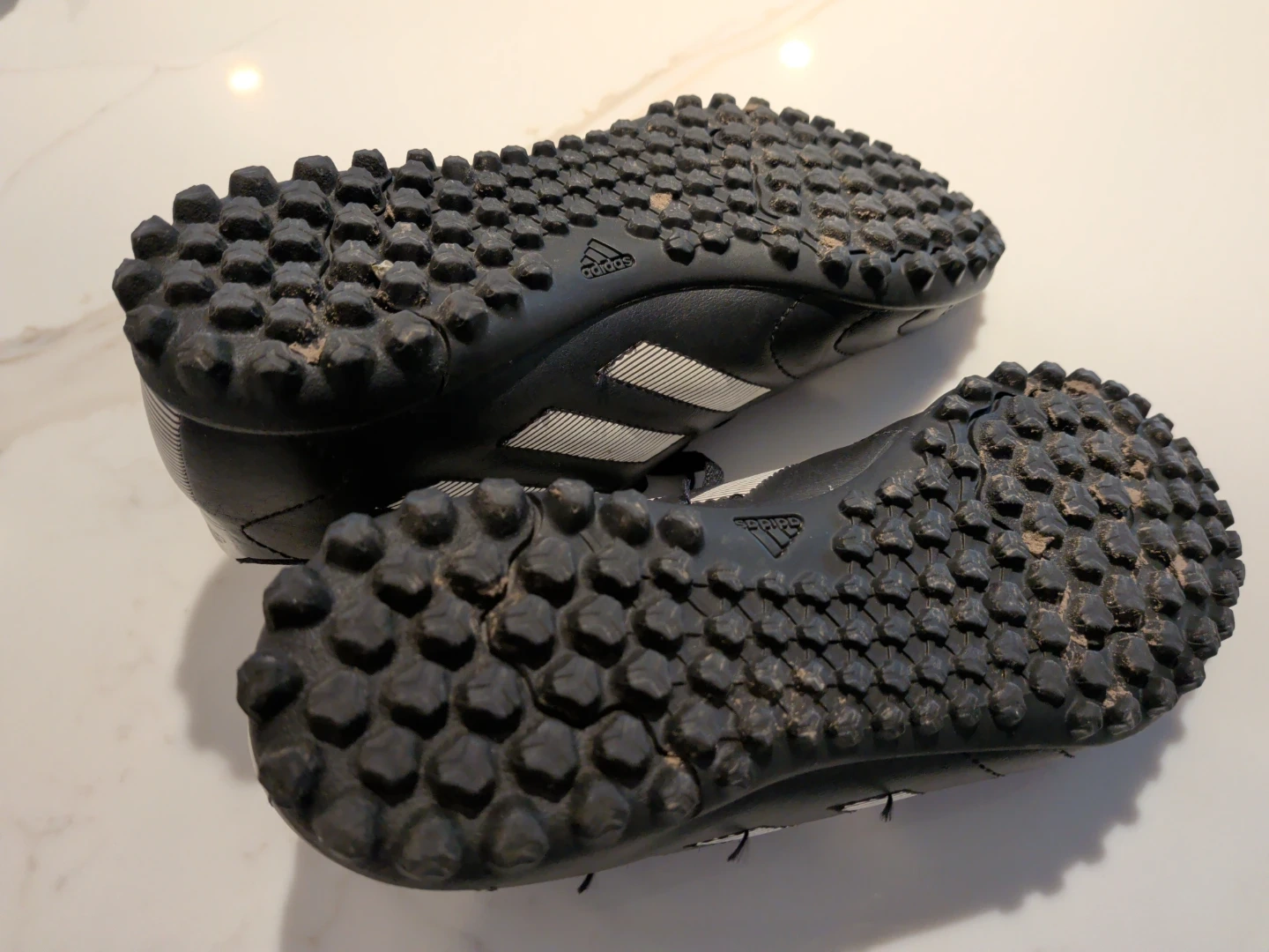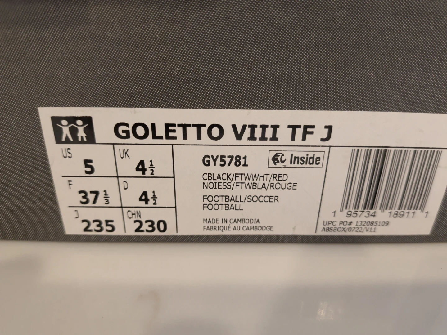 Black Adidas Goletto VIII TF J football cleats. Size US 5, UK 4.5, FR 37.3, JP 235, CHN 230. These cleats are designed for artificial turf and offer good traction. They're ready for the next game!
