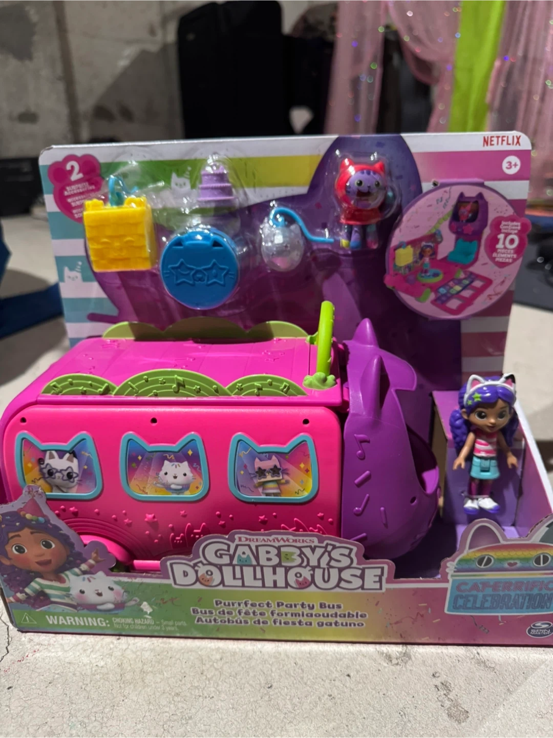 Selling a Gabby's Dollhouse Party Bus! Never opened. It includes 10 pieces/elements. Suitable for ages 3+