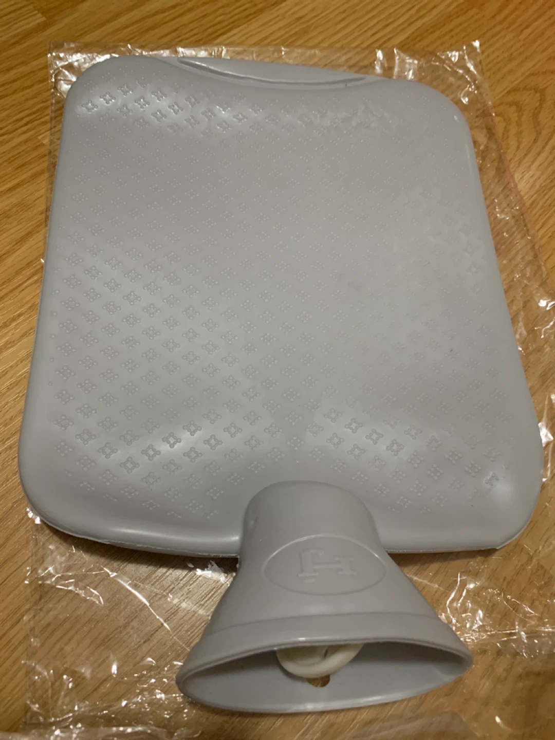 This is a grey hot water bottle. It's made of rubber and measures 25 x 16.5 cm. It's useful for aches, pains, or just staying warm. Suitable for women and anyone experiencing menstrual cramps.
