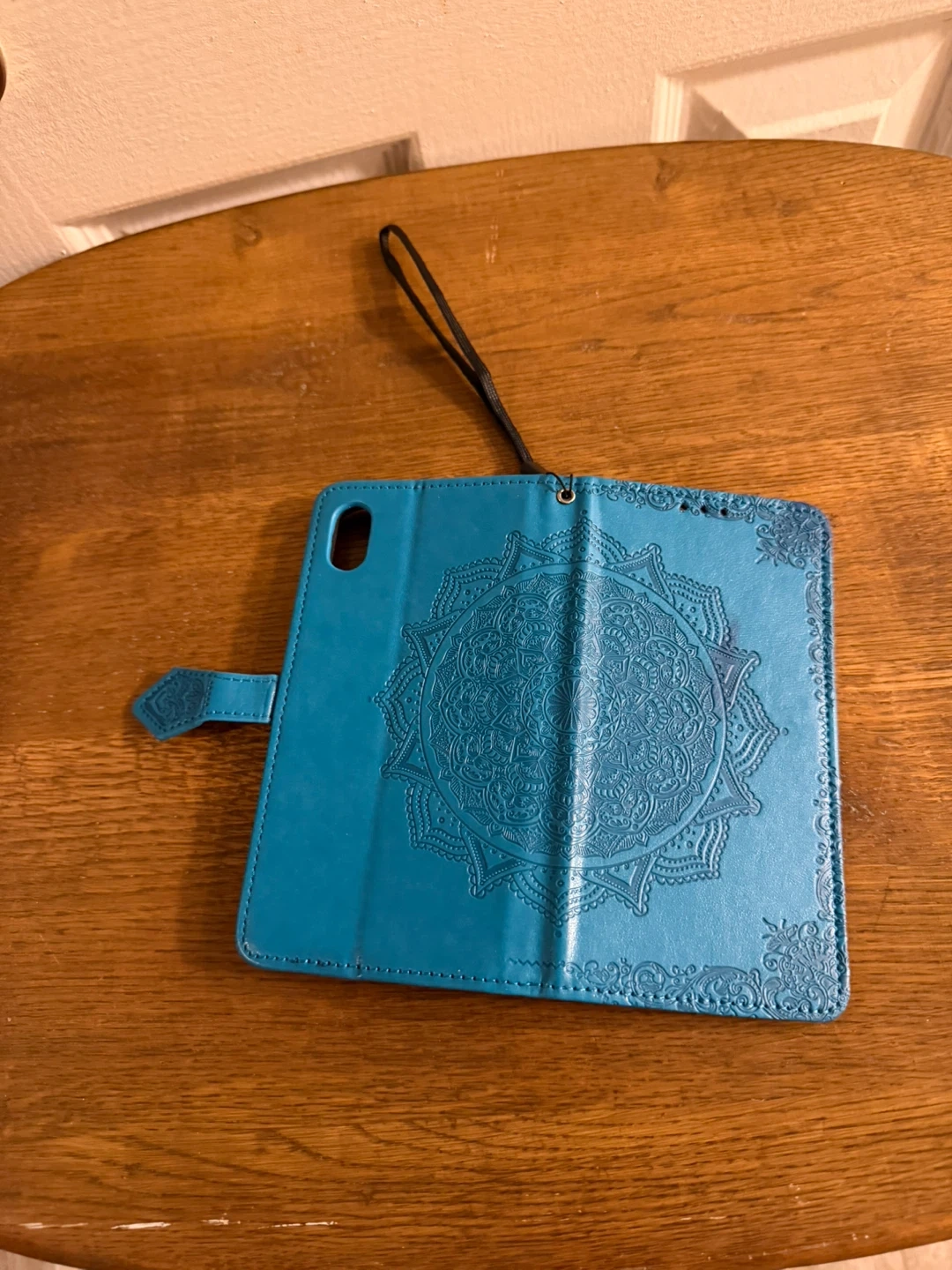 This flip wallet phone case comes in a vibrant blue with an embossed mandala design. It features card slots and a secure clasp. It also includes a convenient wrist strap for easy carrying.