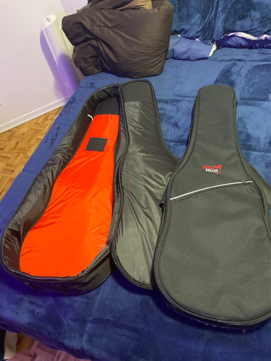 Two black Gator Cases gig bags for electric guitars. They're made of durable black nylon with red interior lining. Each bag has a zippered compartment and handles for carrying.