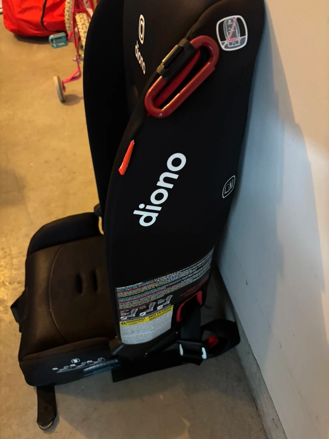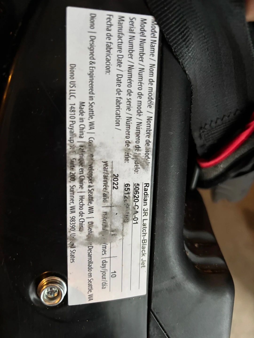 This Diono booster seat is black. It's a Radian 3R model. Manufactured in 2022. Certified for use in aircraft, only when used with a booster mode. Suitable for children from 40 to 120 lbs.