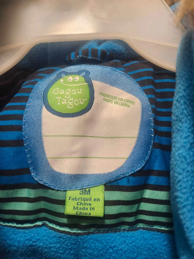 68Keep your little one snug in this adorable Gagou Tagou winter coat bodysuit, perfect for 3-month-old babies! Featuring a cozy design with a hood and built-in mittens, it's ideal for chilly days. This item is new, never used.