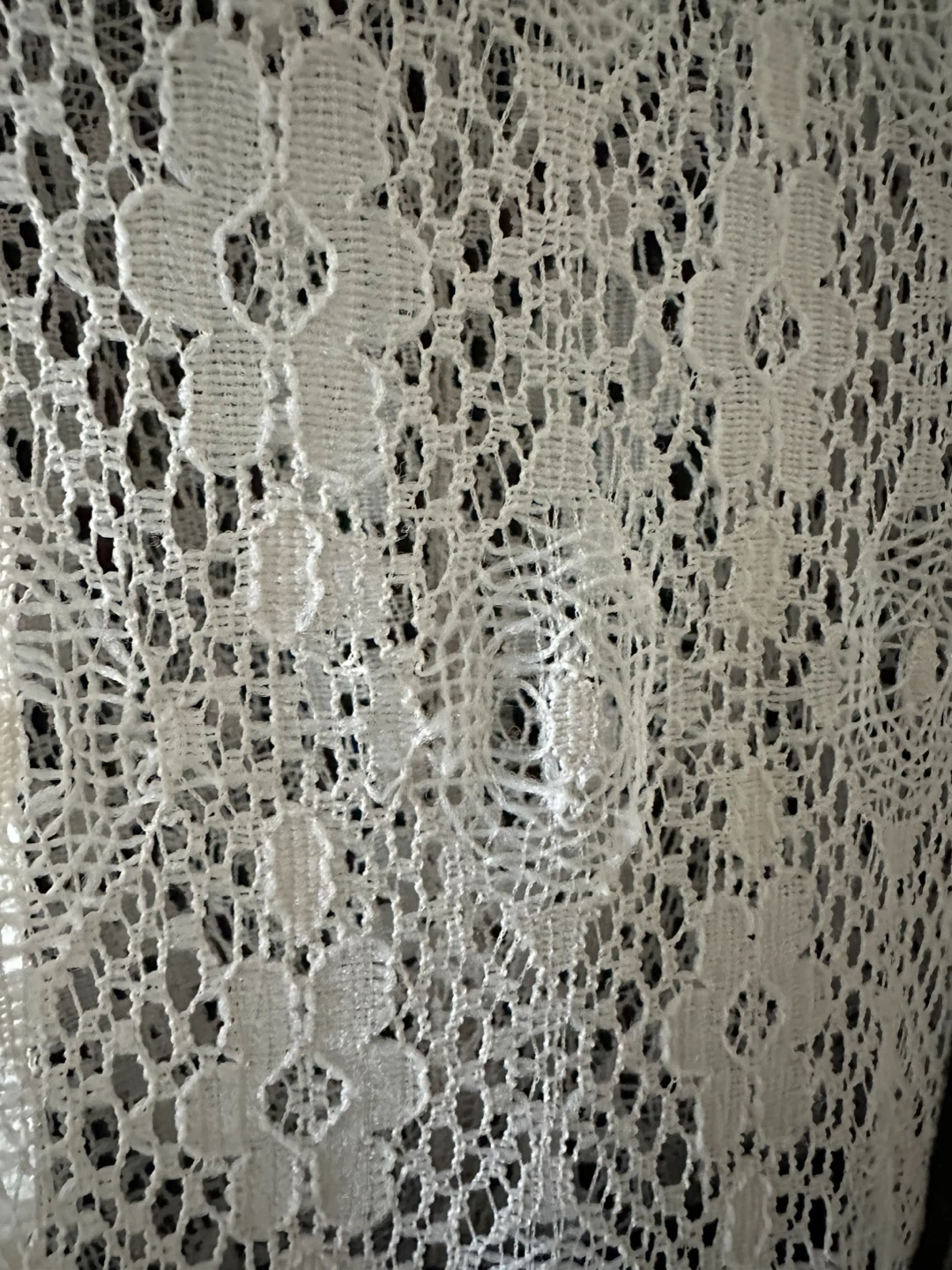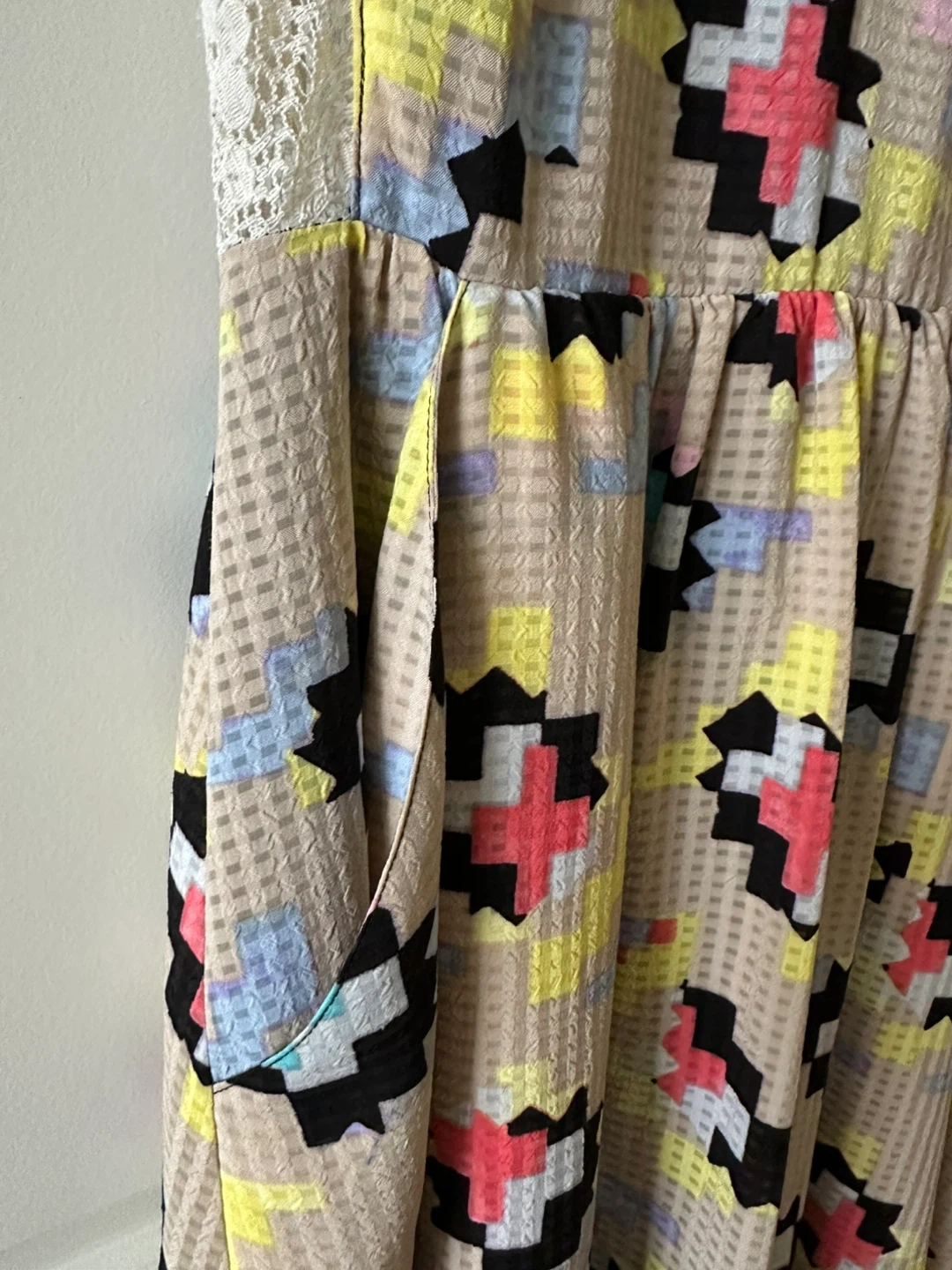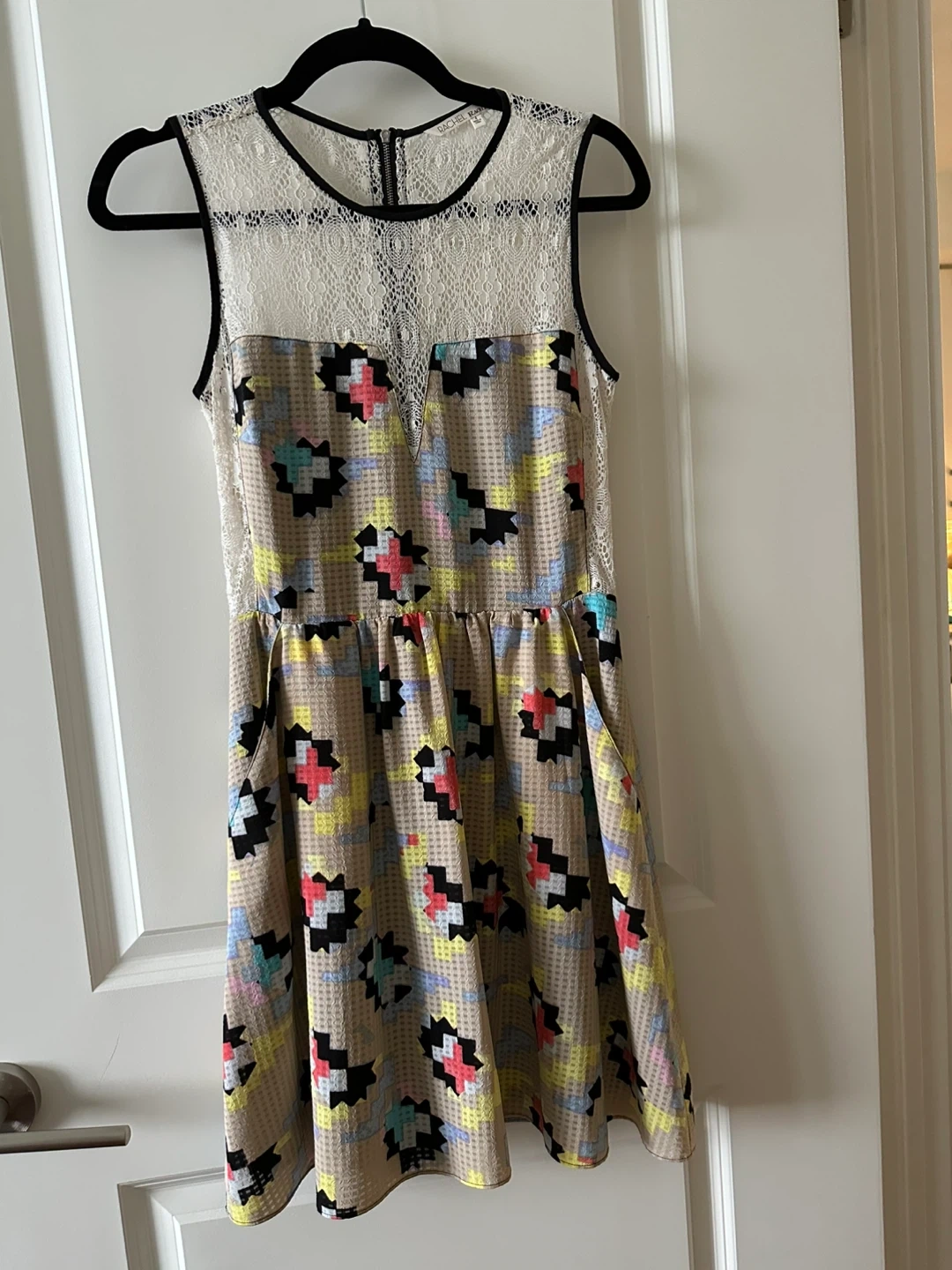 Short A-line dress. Features a colourful geometric print and a lace bodice. Zipper closure on back. Has pockets. Black liner under skirt. Minor lace wear and tear on side/back (see photos). Size 4.