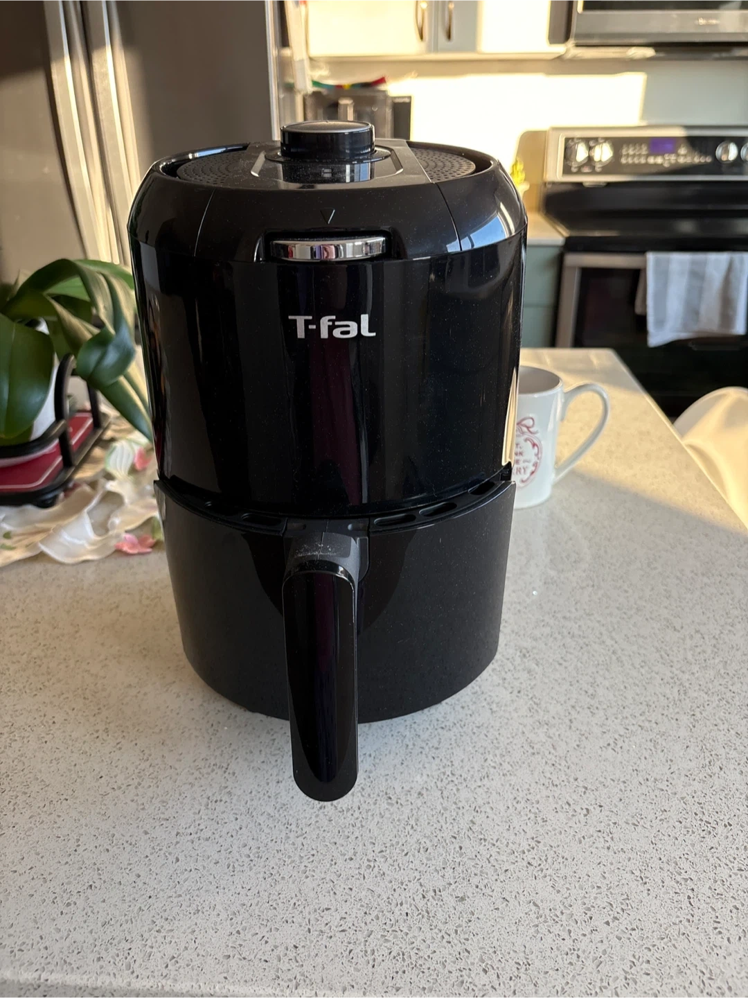 This T-fal air fryer is black and compact. It's great for quickly preparing small batches of food. Use it to make crispy snacks or reheat leftovers. Like New