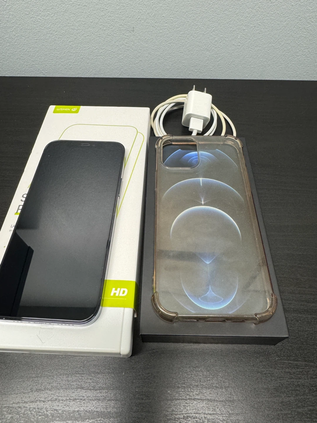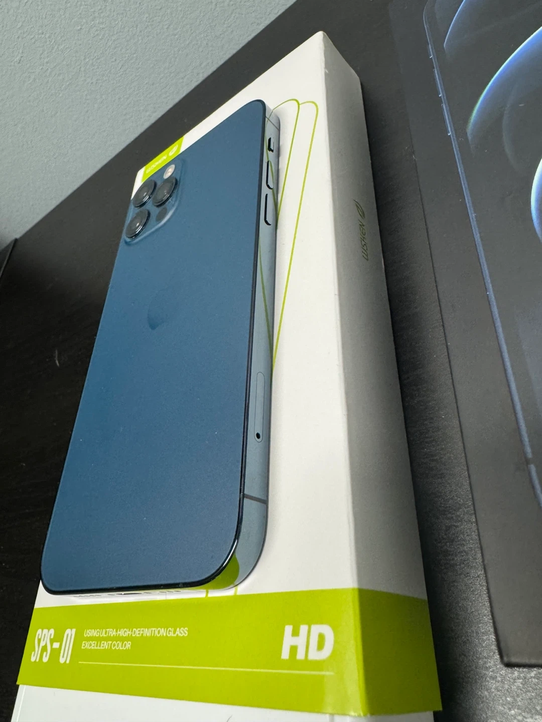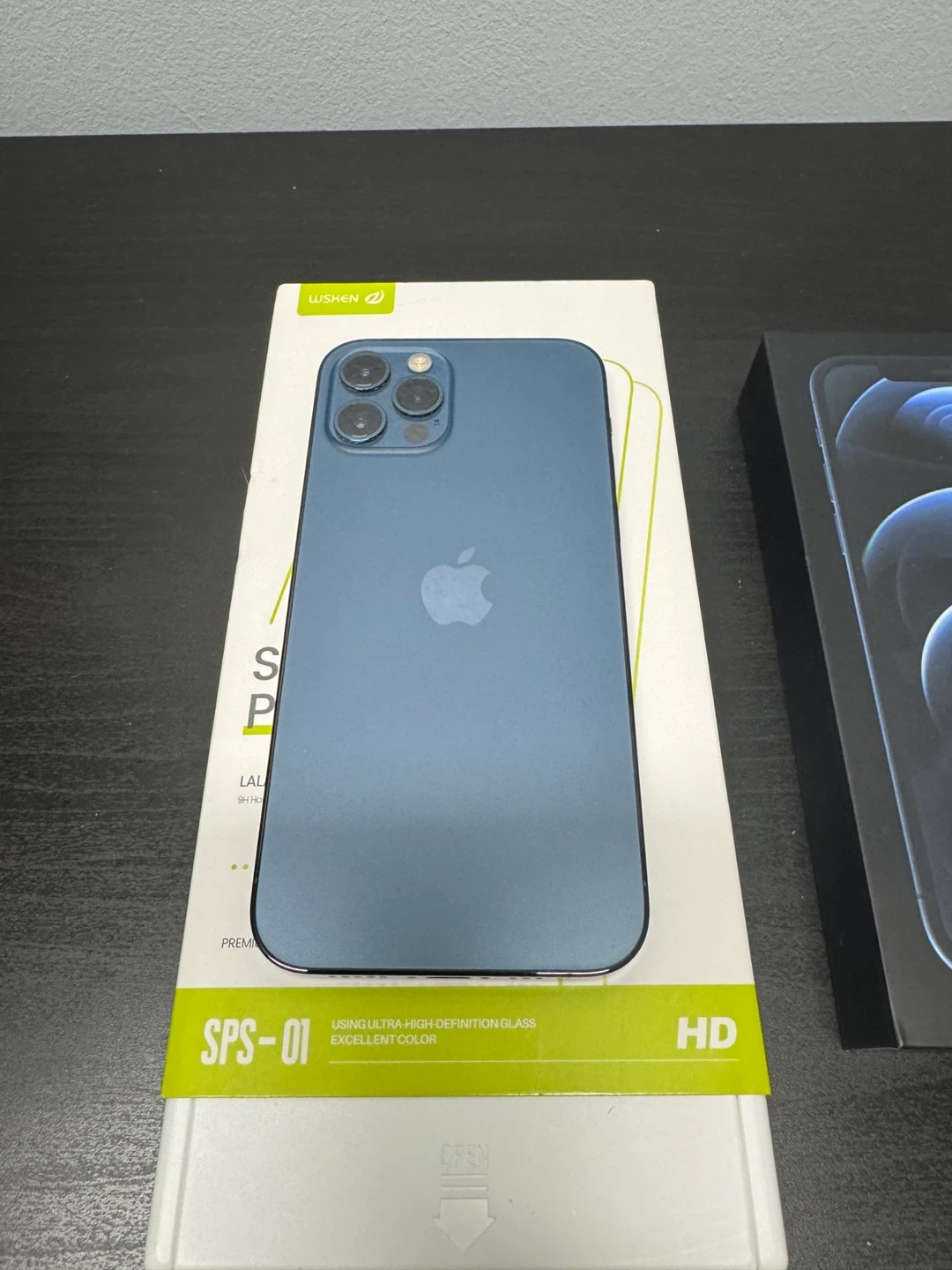 Selling an iPhone 12 Pro in blue! It comes with a screen protector (one extra one, current one just applied) and a charger and original box. The case and screen protector has been applied since opened from the box and it is well well protected.