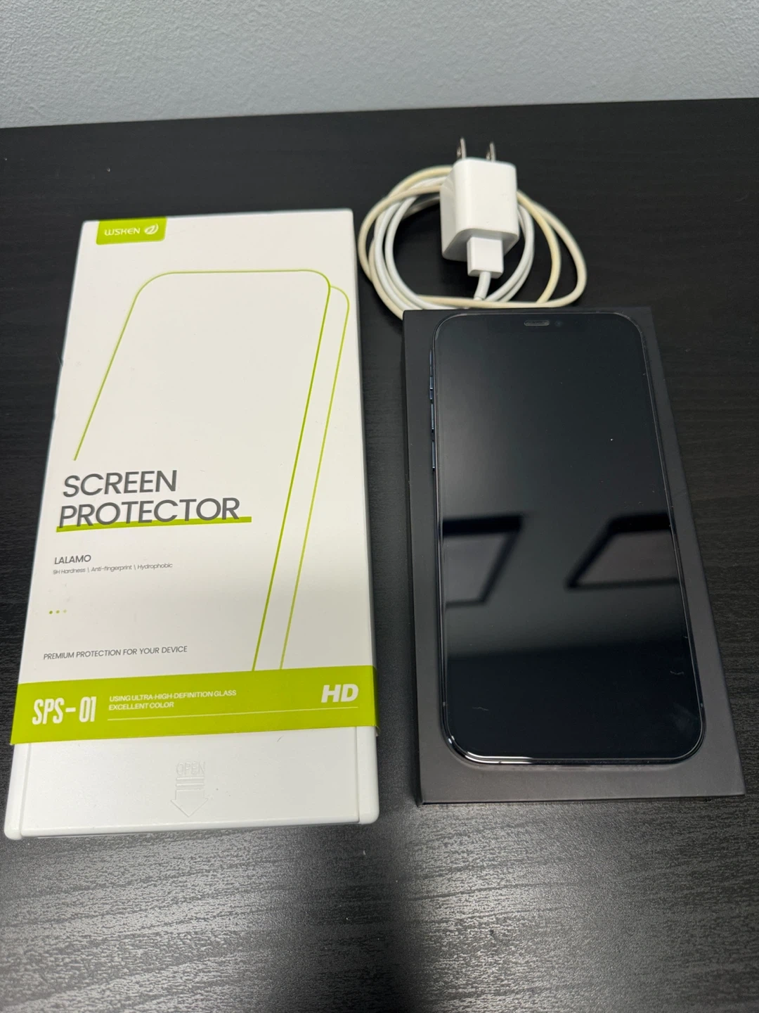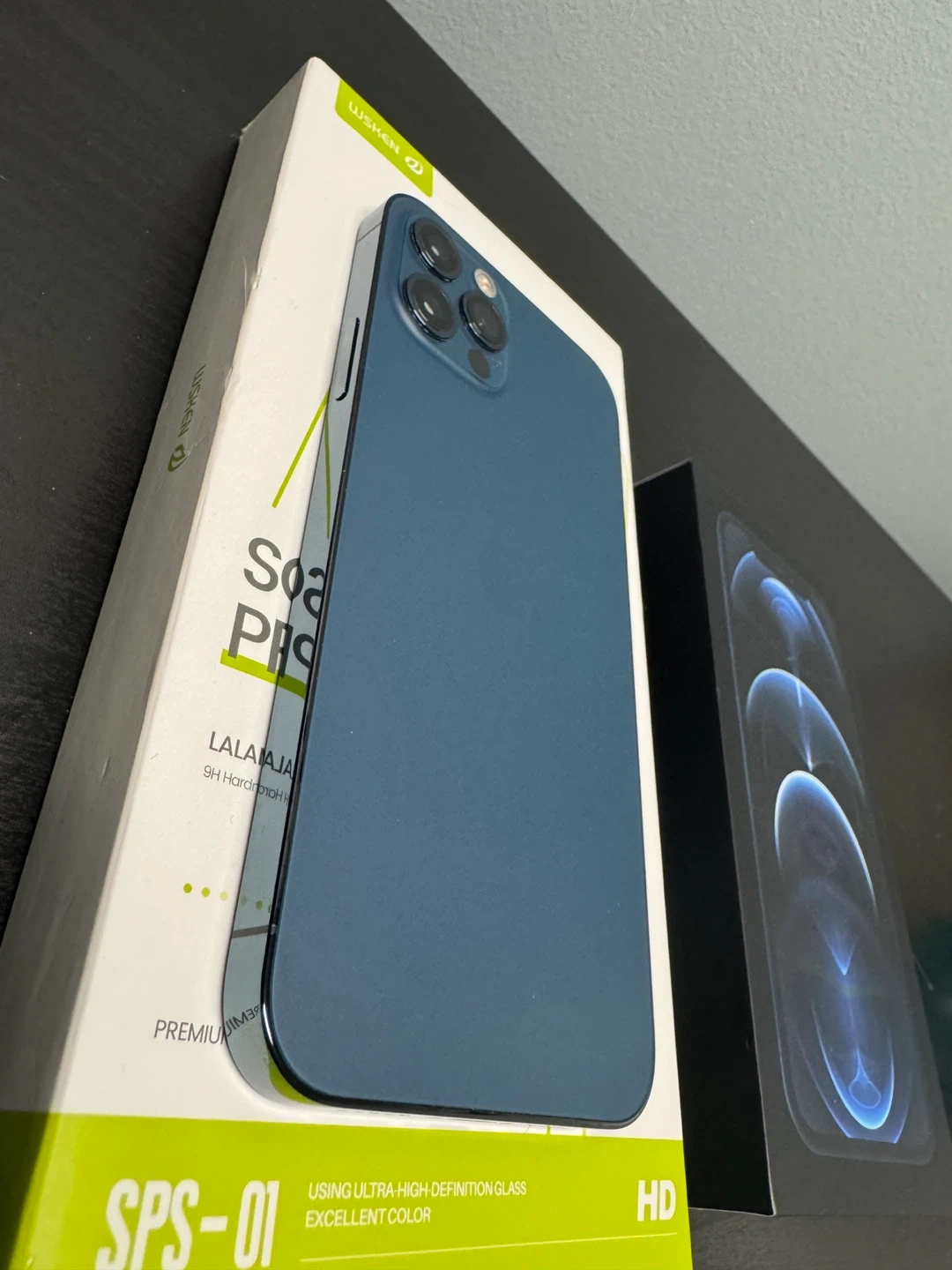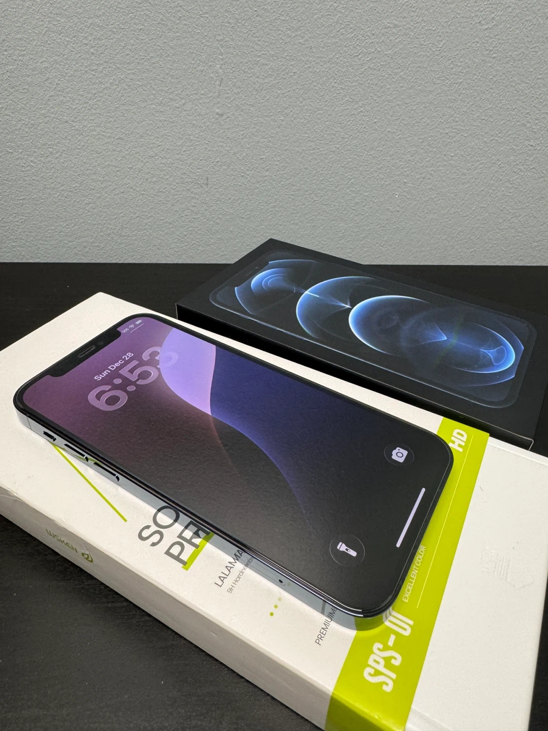 Selling an iPhone 12 Pro in blue! It comes with a screen protector (one extra one, current one just applied) and a charger and original box. The case and screen protector has been applied since opened from the box and it is well well protected.